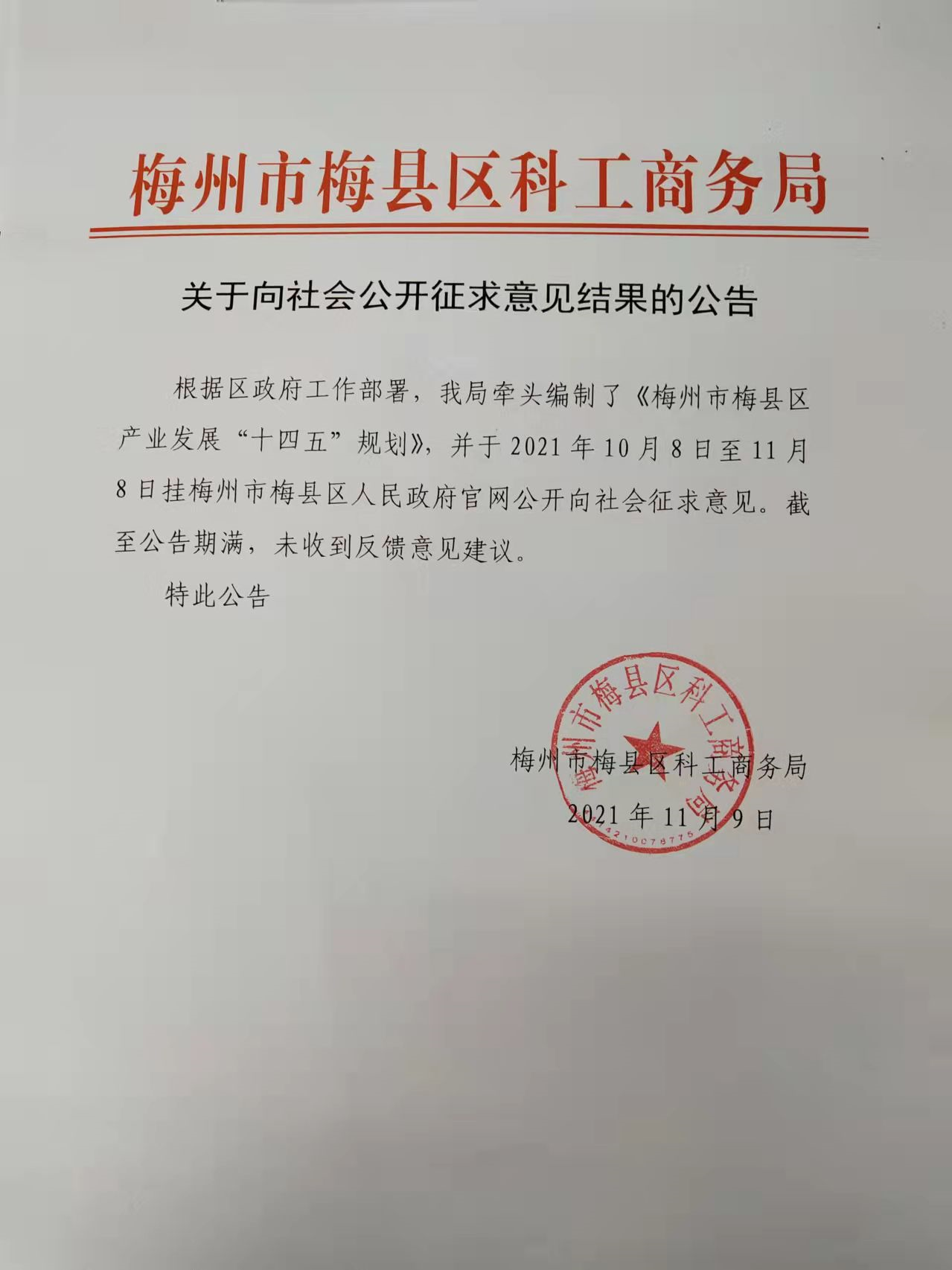 關于向社會公開征求《梅州市梅縣區產業發展“十四五”規劃》意見結果的公告