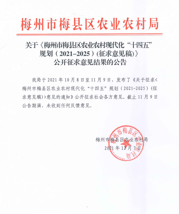 關于《梅州市梅縣區農業農村現代化“十四五”規劃(2021-2025)(征求意見稿)》公開征求意見結果的公告