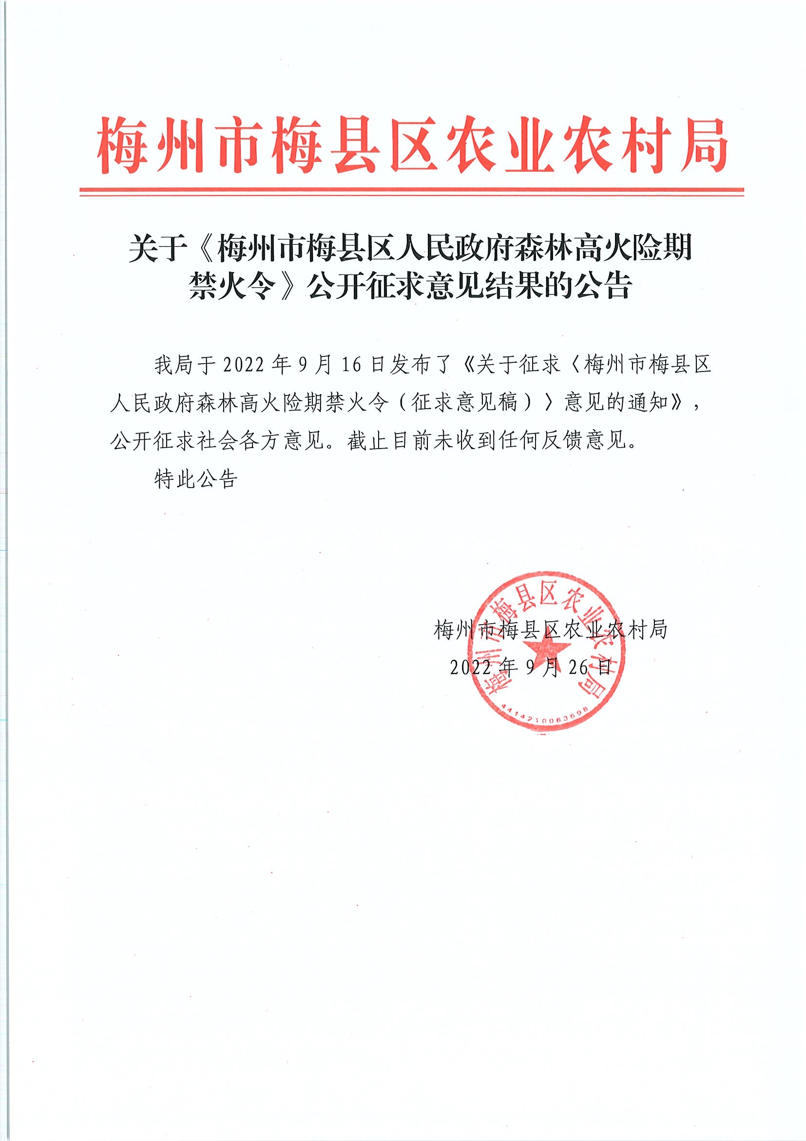 關于《梅州市梅縣區人民政府森林高火險期禁火令》公開征求意見結果的公告