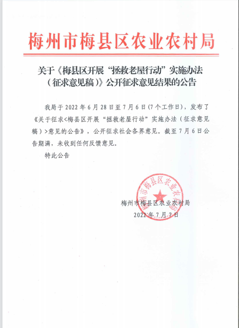 關(guān)于《梅縣區(qū)開展“拯救老屋行動”實施辦法(征求意見稿)》公開征求意見結(jié)果的公告