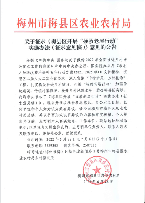 關于征求《梅縣區開展“拯救老屋行動”實施辦法(征求意見稿)》意見的公告
