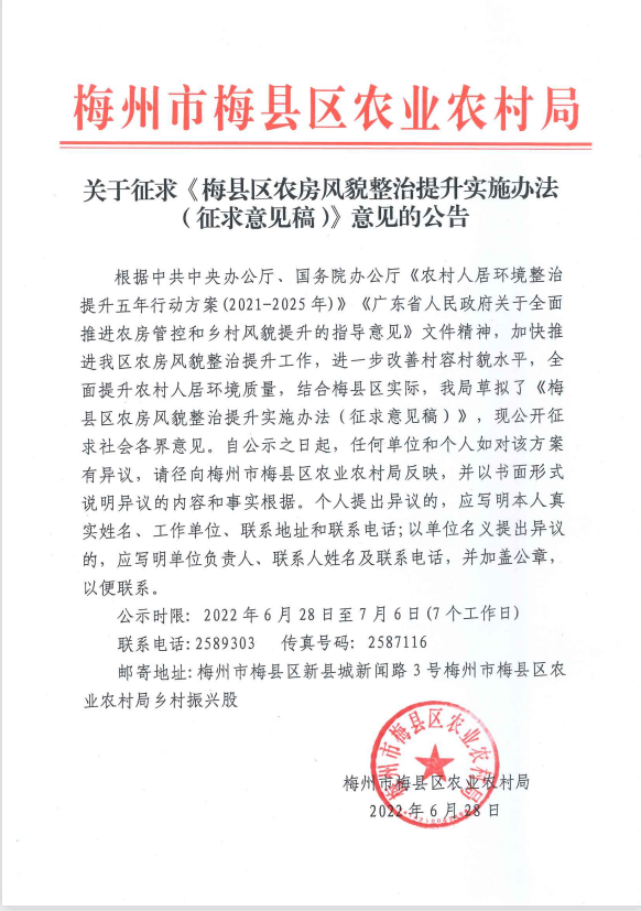 關(guān)于征求《梅縣區(qū)農(nóng)房風(fēng)貌整治提升實(shí)施辦法(征求意見稿)》意見的公告