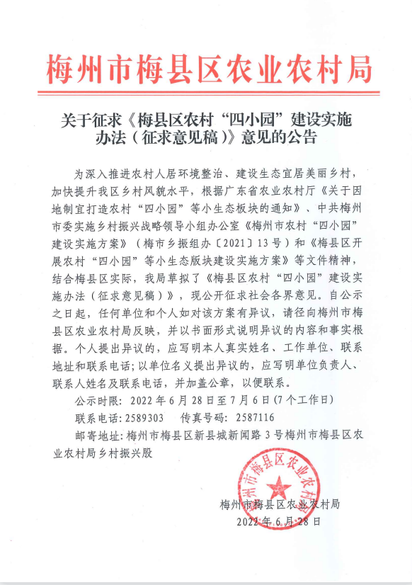關于征求《梅縣區農村“四小園”建設實施辦法(征求意見稿)》意見的公告