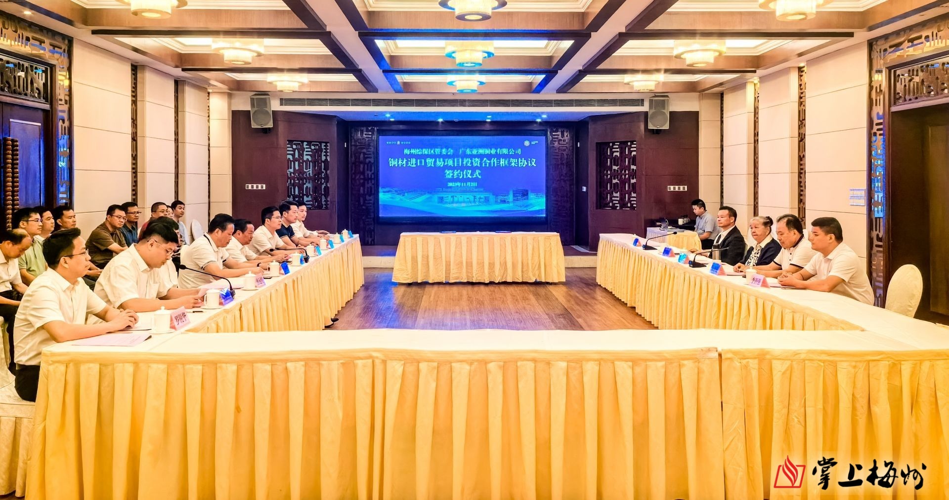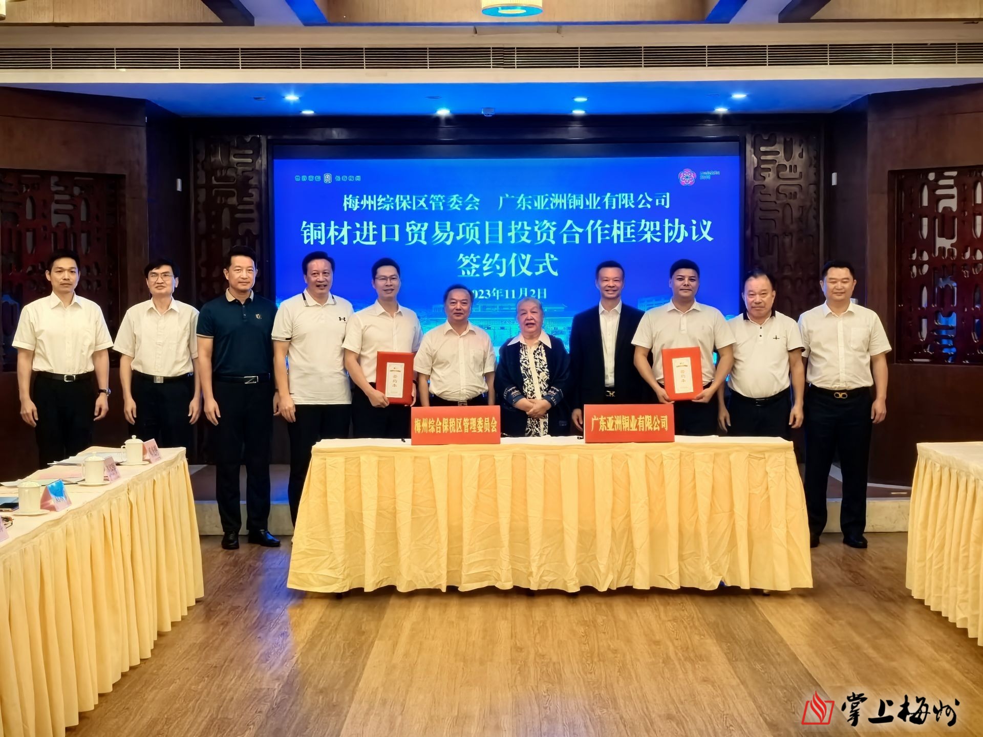 儀式現場,梅縣區委副書記、區長、梅州綜保區管委會主任王鋒代表梅州綜保區與廣東亞洲銅業有限公司法人代表李新強簽訂銅材進口貿易項目投資合作框架協議。據介紹,項目進出口總額預計可達 100 億元,這是梅州綜保區一期封關運行以來簽約的年進出口值最大的合作項目,為接下來打通銅箔產業上下游、發展保稅業務奠定堅實基礎。