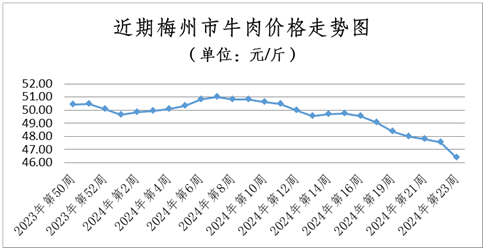 牛肉價格保持下跌行情。監(jiān)測的三類牛肉均價為44.79元/斤,環(huán)比下降1.91%。其中,牛肉46.41元/斤、腱子肉50.14元/斤、牛腩37.83元/斤,分別環(huán)比下降2.42%、1.38%、1.94%。
