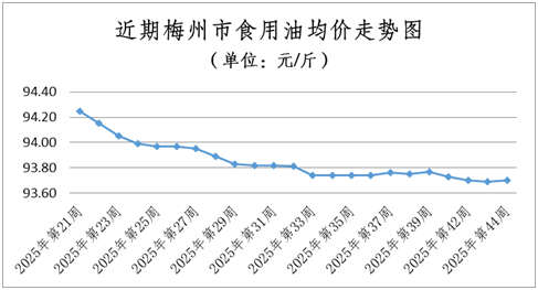 糧油價格基本穩定。本周糧食均價為3.22元/斤,環比(與2025年第43周相比,下同)持平;食用油均價為93.70元/桶(5L),環比微升0.01%。
