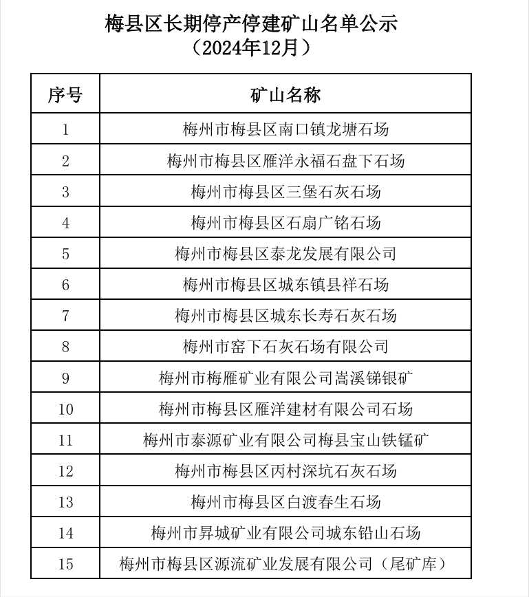 梅縣區長期停產停建礦山名單公示(2024年12月)