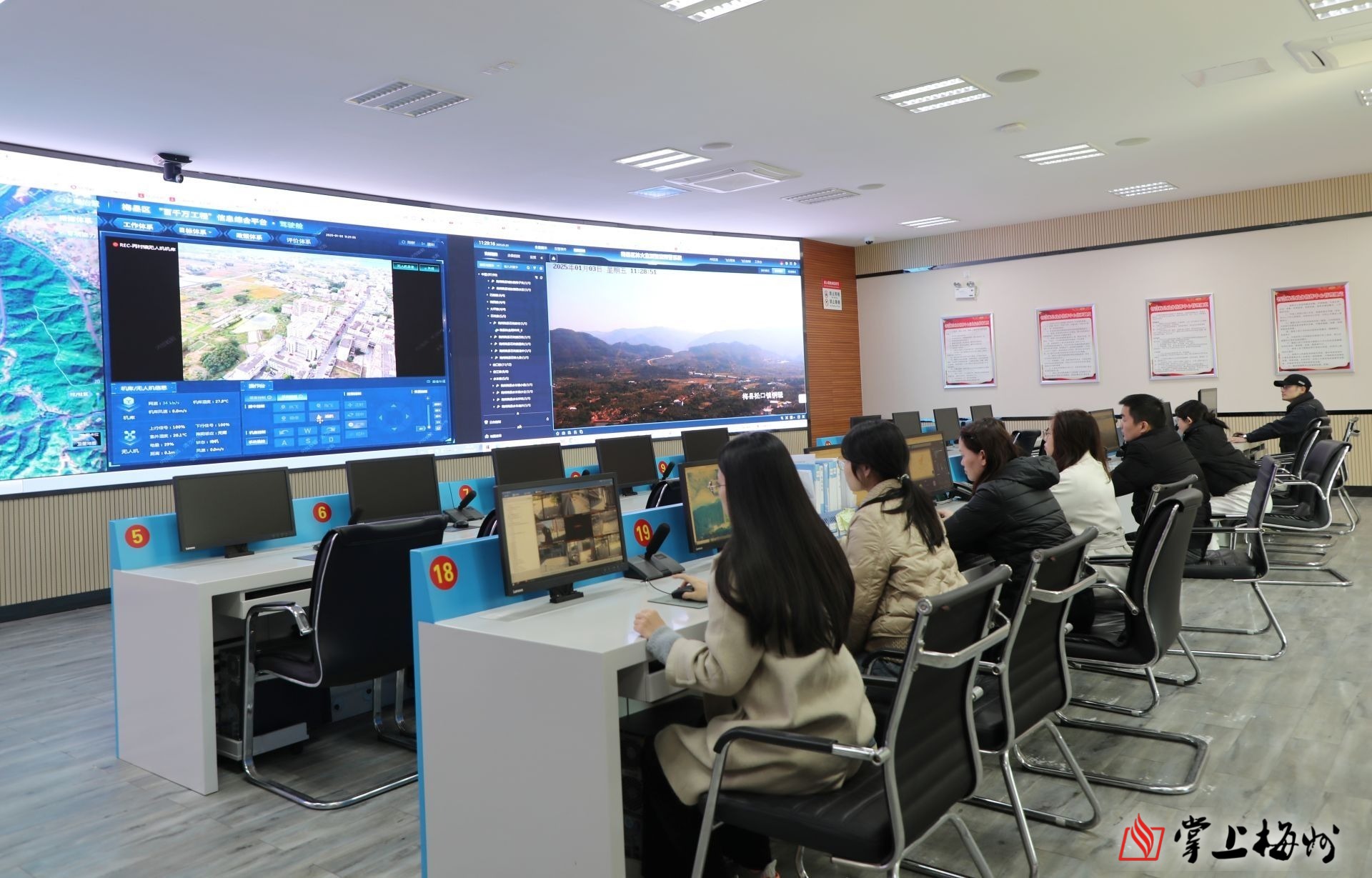 在智慧梅縣政務指揮中心,工作人員緊盯大屏幕對無人機進行指揮調度。