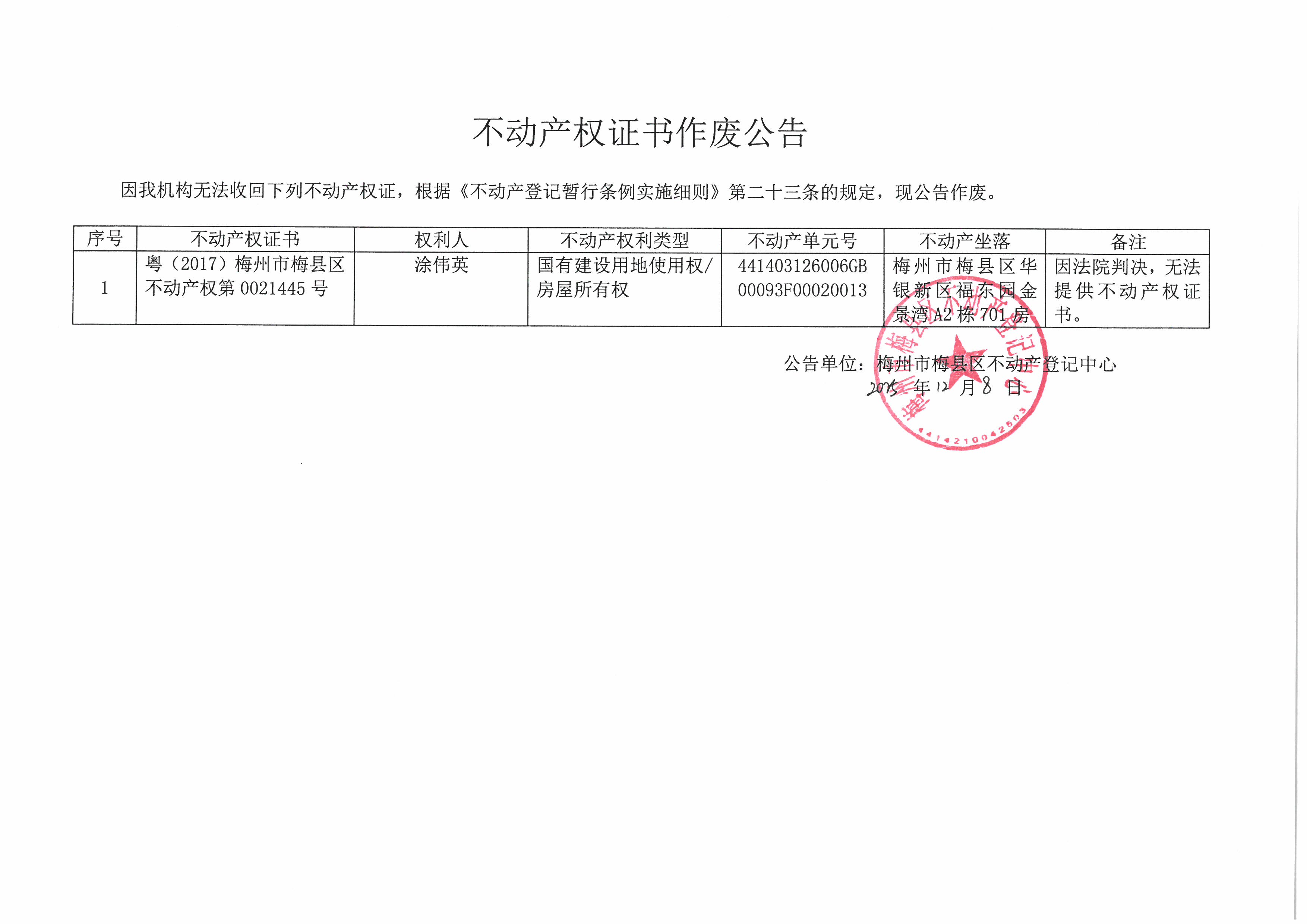 不動產登記中心登記公告(作廢公告-涂偉英-粵(2017)梅州市梅縣區不動產權第0021445號)