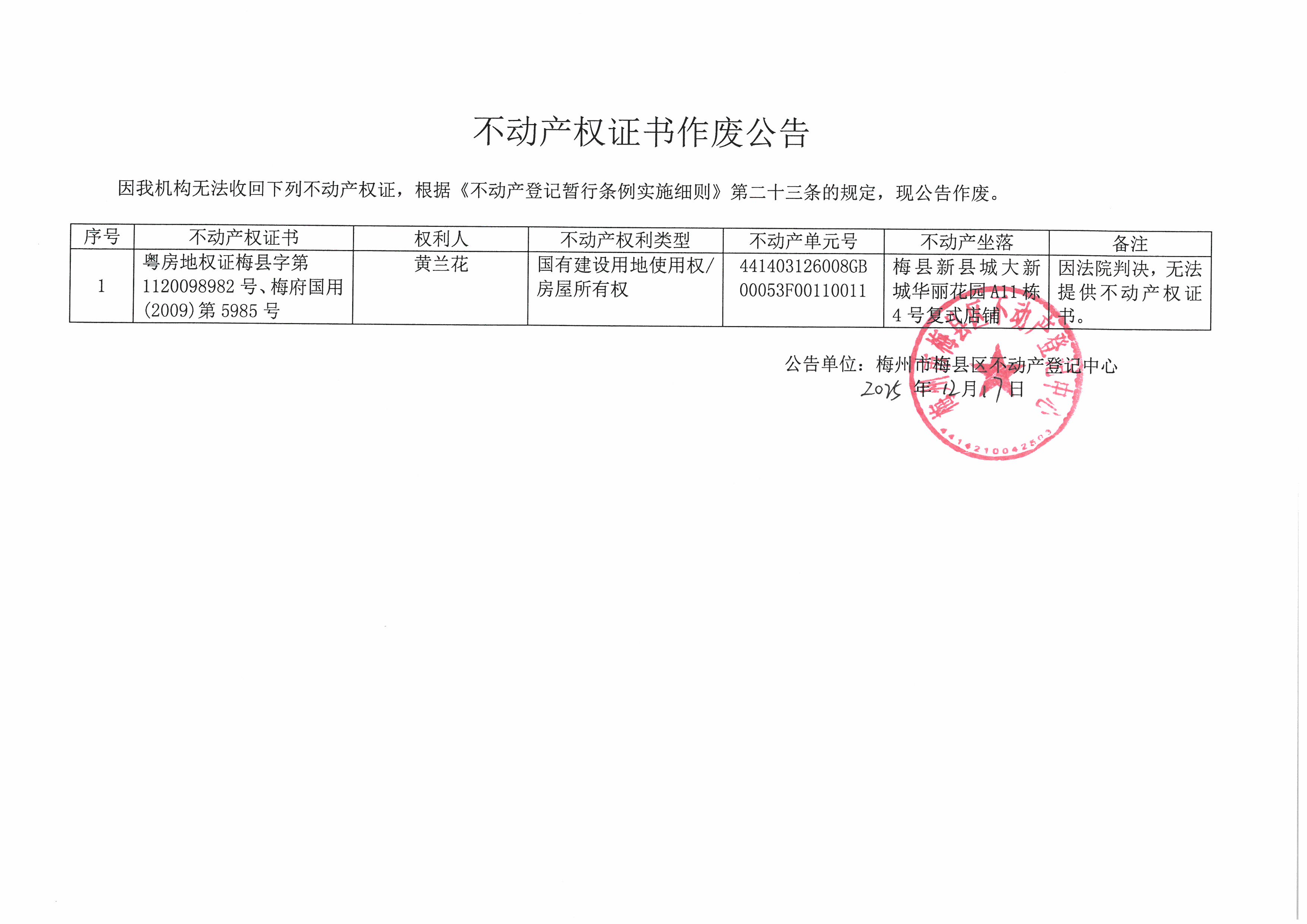 不動產登記中心登記公告(作廢公告-黃蘭花-粵房地權證梅縣字第1120098982號、梅府國用(2009)第5985號)