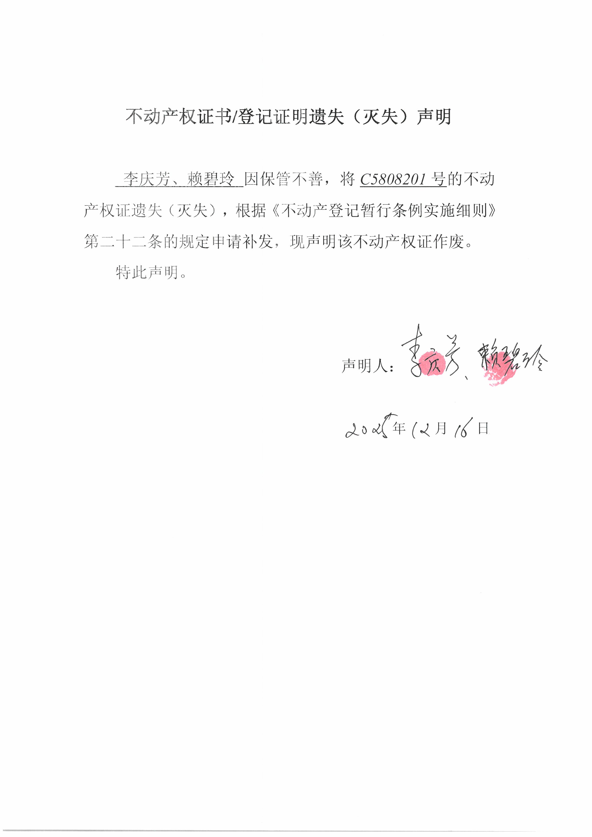 李慶芳、賴碧玲因保管不善,將C5808201號(hào)的不動(dòng)產(chǎn)權(quán)證遺失(滅失),根據(jù)《不動(dòng)產(chǎn)登記暫行條例實(shí)施細(xì)則》第二十二條的規(guī)定申請(qǐng)補(bǔ)發(fā),現(xiàn)聲明該不動(dòng)產(chǎn)權(quán)證作廢。