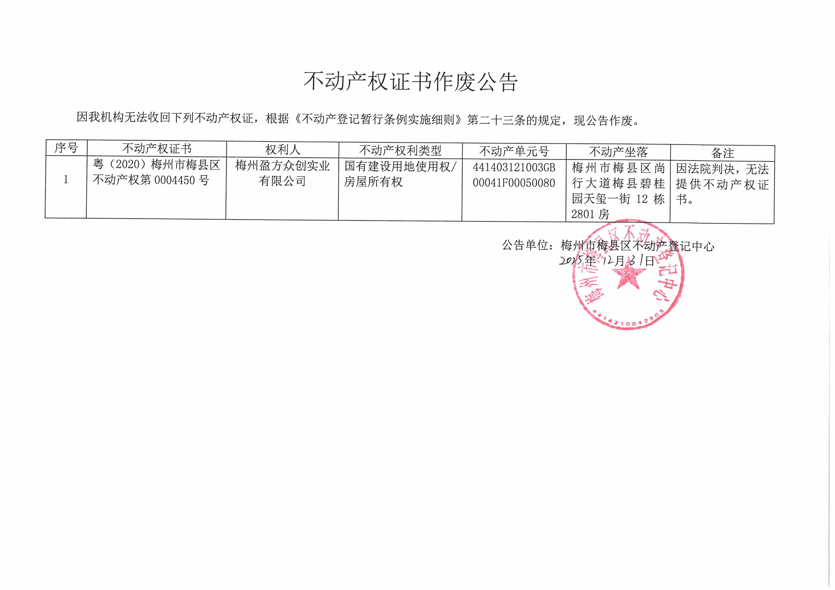 不動產登記中心登記公告(作廢公告-梅州盈方眾創實業有限公司-粵(2020)梅州市梅縣區不動產權第0004450號)