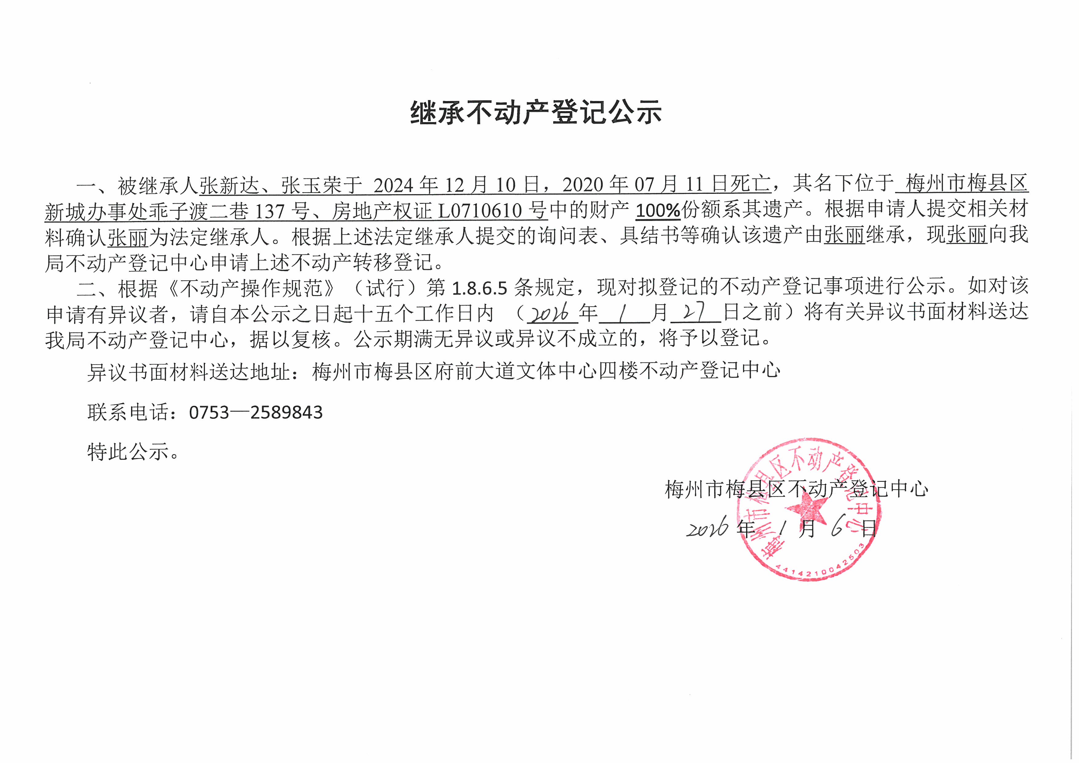 被繼承人張新達(dá)、張玉榮于2024年12月10日,2020年07月11日死亡,其名下位于梅州市梅縣區(qū)新城辦事處乖子渡二巷137號、房地產(chǎn)權(quán)證L0710610號中的財產(chǎn)100%份額系其遺產(chǎn)。根據(jù)申請人提交相關(guān)材料確認(rèn)張麗為法定繼承人。根據(jù)上述法定繼承人提交的詢問表、具結(jié)書等確認(rèn)該遺產(chǎn)由張麗繼承,現(xiàn)張麗向我局不動產(chǎn)登記中心申請上述不動產(chǎn)轉(zhuǎn)移登記。