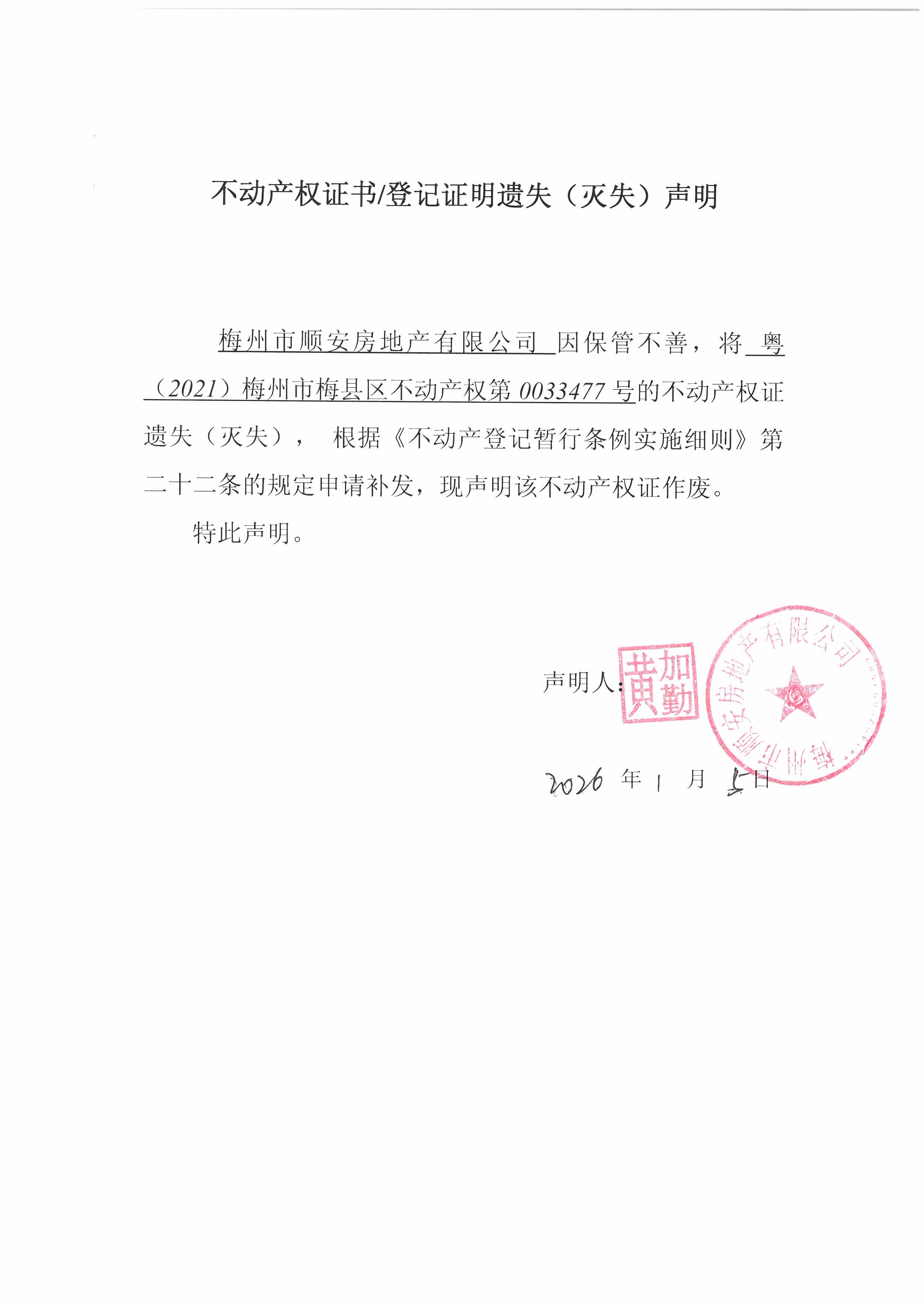 梅州市順安房地產有限公司因保管不善,將粵(2021)梅州市梅縣區不動產權第0033477號的不動產權證遺失(滅失),根據《不動產登記暫行條例實施細則》第二十二條的規定申請補發,現聲明該不動產權證作廢。