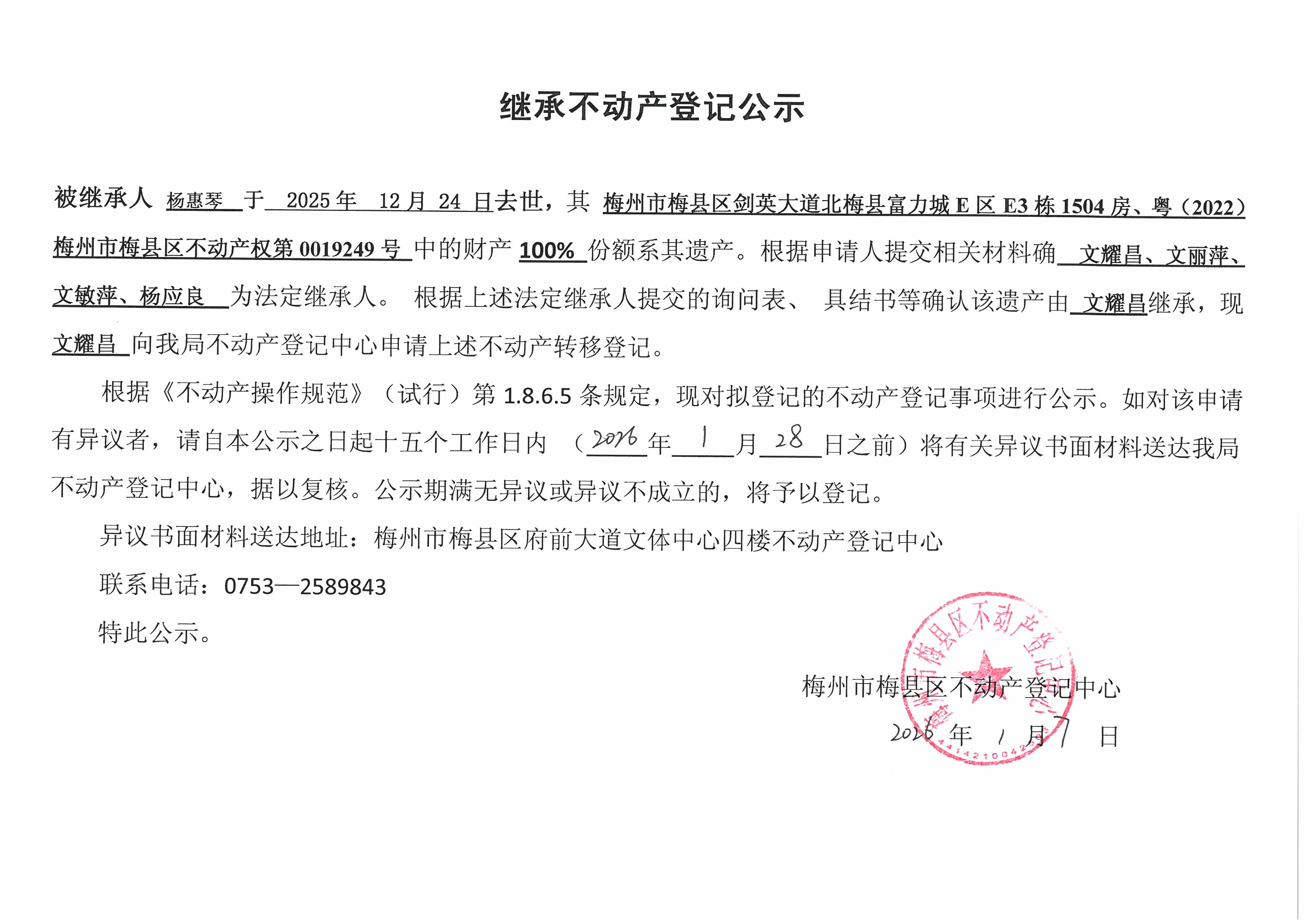 被繼承人楊惠琴于2025年12月24日去世,其梅州市梅縣區劍英大道北梅縣富力城E區E3棟1504房、粵(2022)梅州市梅縣區不動產權第0019249號中的財產100%份額系其遺產。根據申請人提交相關材料確文耀昌、文麗萍、文敏萍、楊應良為法定繼承人。根據上述法定繼承人提交的詢問表、具結書等確認該遺產由文耀昌繼承,現文耀昌向我局不動產登記中心申請上述不動產轉移登記。