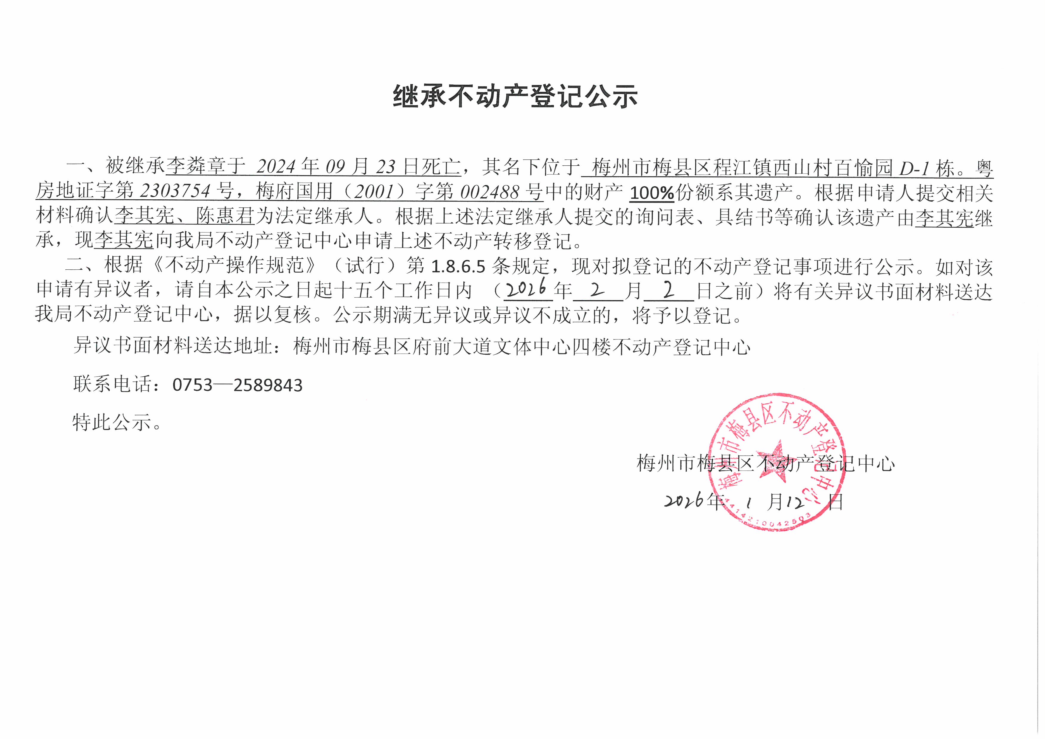 被繼承李粦章于 2024年09月23日死亡,其名下位于 梅州市梅縣區程江鎮西山村百愉園D-1棟。粵房地證字第2303754號,梅府國用(2001)字第002488號中的財產100%份額系其遺產。根據申請人提交相關材料確認李其憲、陳惠君為法定繼承人。根據上述法定繼承人提交的詢問表、具結書等確認該遺產由李其憲繼承,現李其憲向我局不動產登記中心申請上述不動產轉移登記。