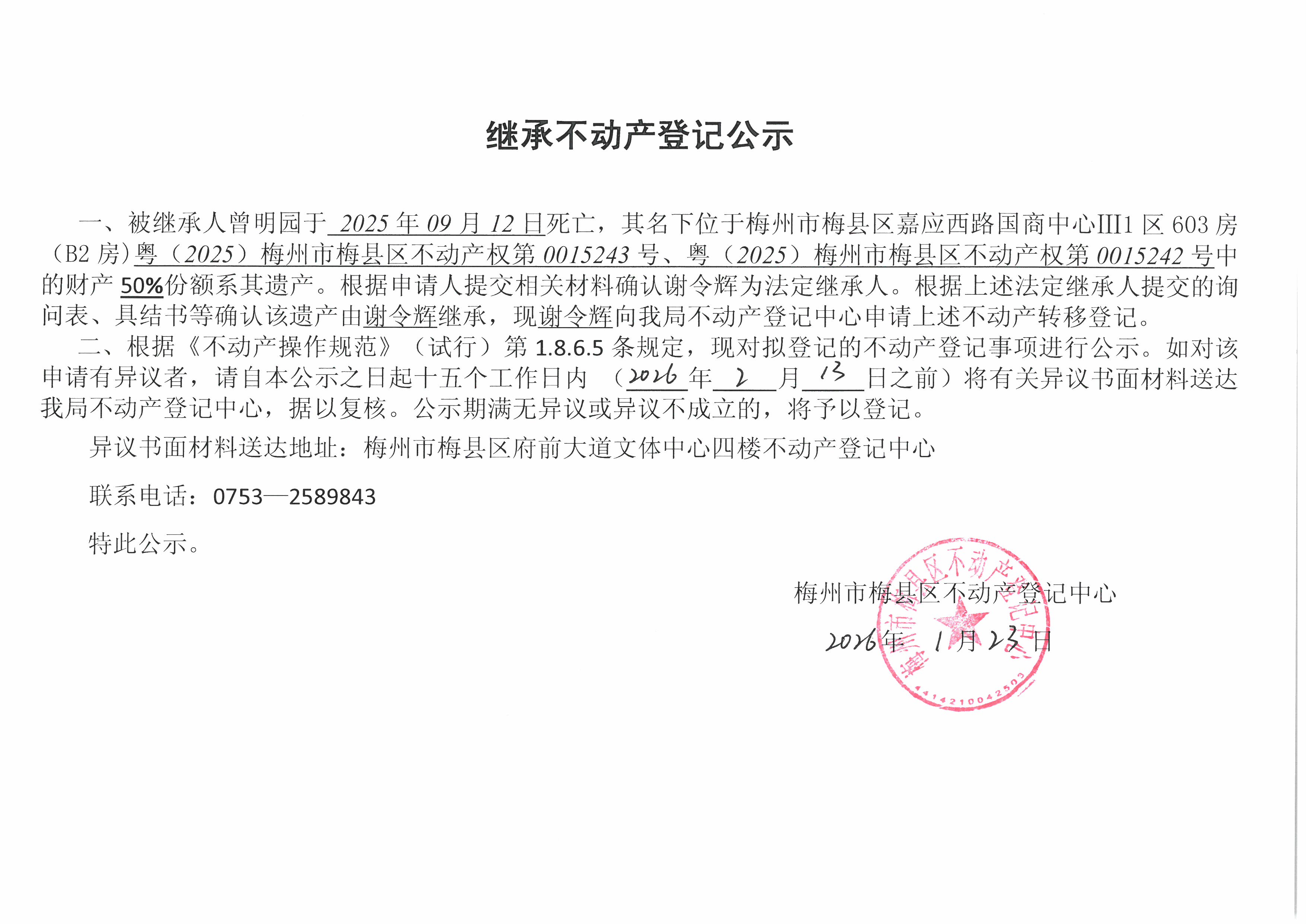 被繼承人曾明園于2025年09月12日死亡,其名下位于梅州市梅縣區嘉應西路國商中心Ш1區603房(B2房),粵(2025)梅州市梅縣區不動產權第0015243號、粵(2025)梅州市梅縣區不動產權第0015242號中的財產50%份額系其遺產。根據申請人提交相關材料確認謝令輝為法定繼承人。根據上述法定繼承人提交的詢問表、具結書等確認該遺產由謝令輝繼承,現謝令輝向我局不動產登記中心申請上述不動產轉移登記。