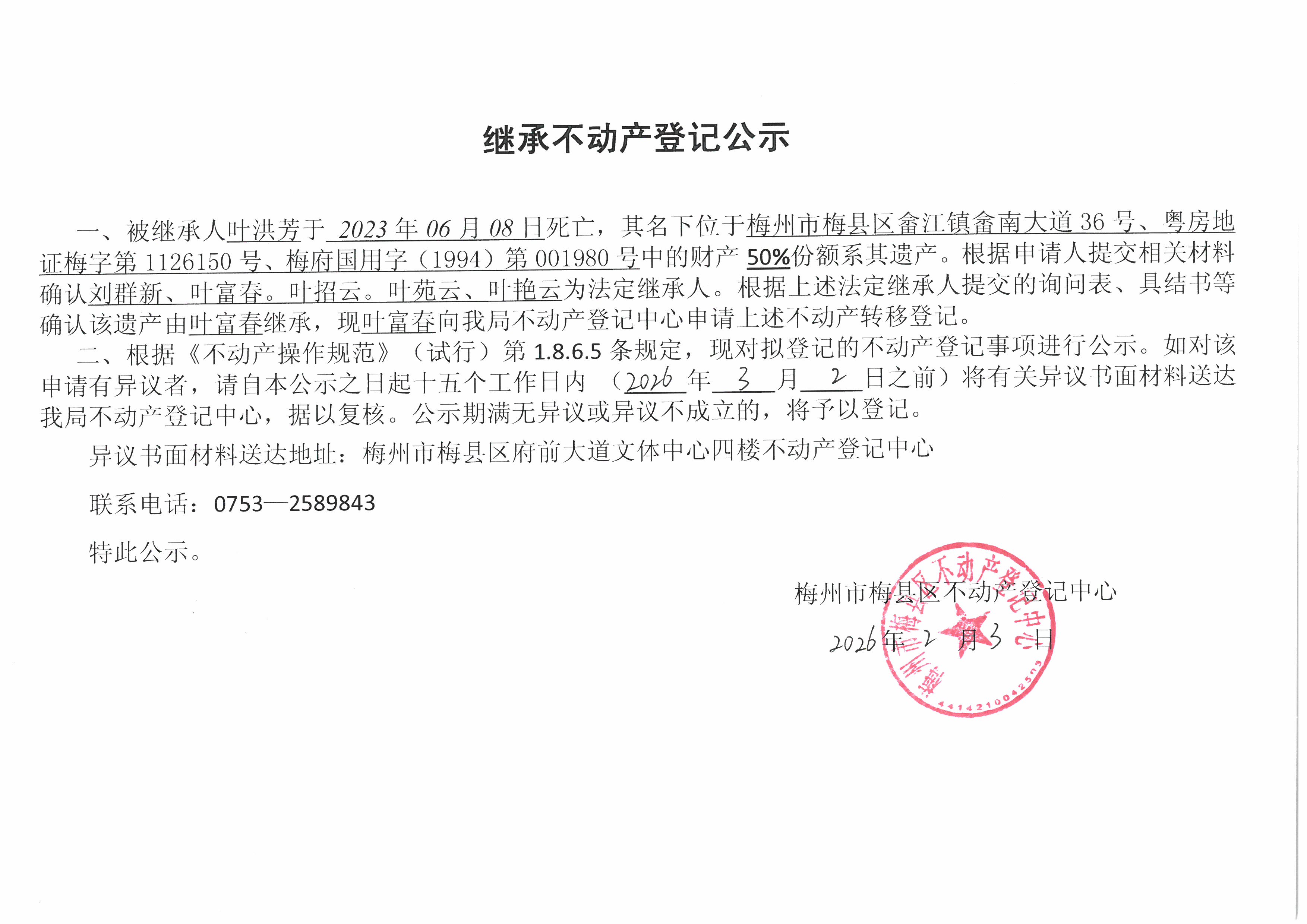 被繼承人葉洪芳于2023年06月08日死亡,其名下位于梅州市梅縣區(qū)畬江鎮(zhèn)畬南大道36號(hào)、粵房地證梅字第1126150號(hào)、梅府國用字(1994)第001980號(hào)中的財(cái)產(chǎn)50%份額系其遺產(chǎn)。根據(jù)申請(qǐng)人提交相關(guān)材料確認(rèn)劉群新、葉富春。葉招云。葉苑云、葉艷云為法定繼承人。根據(jù)上述法定繼承人提交的詢問表、具結(jié)書等確認(rèn)該遺產(chǎn)由葉富春繼承,現(xiàn)葉富春向我局不動(dòng)產(chǎn)登記中心申請(qǐng)上述不動(dòng)產(chǎn)轉(zhuǎn)移登記。