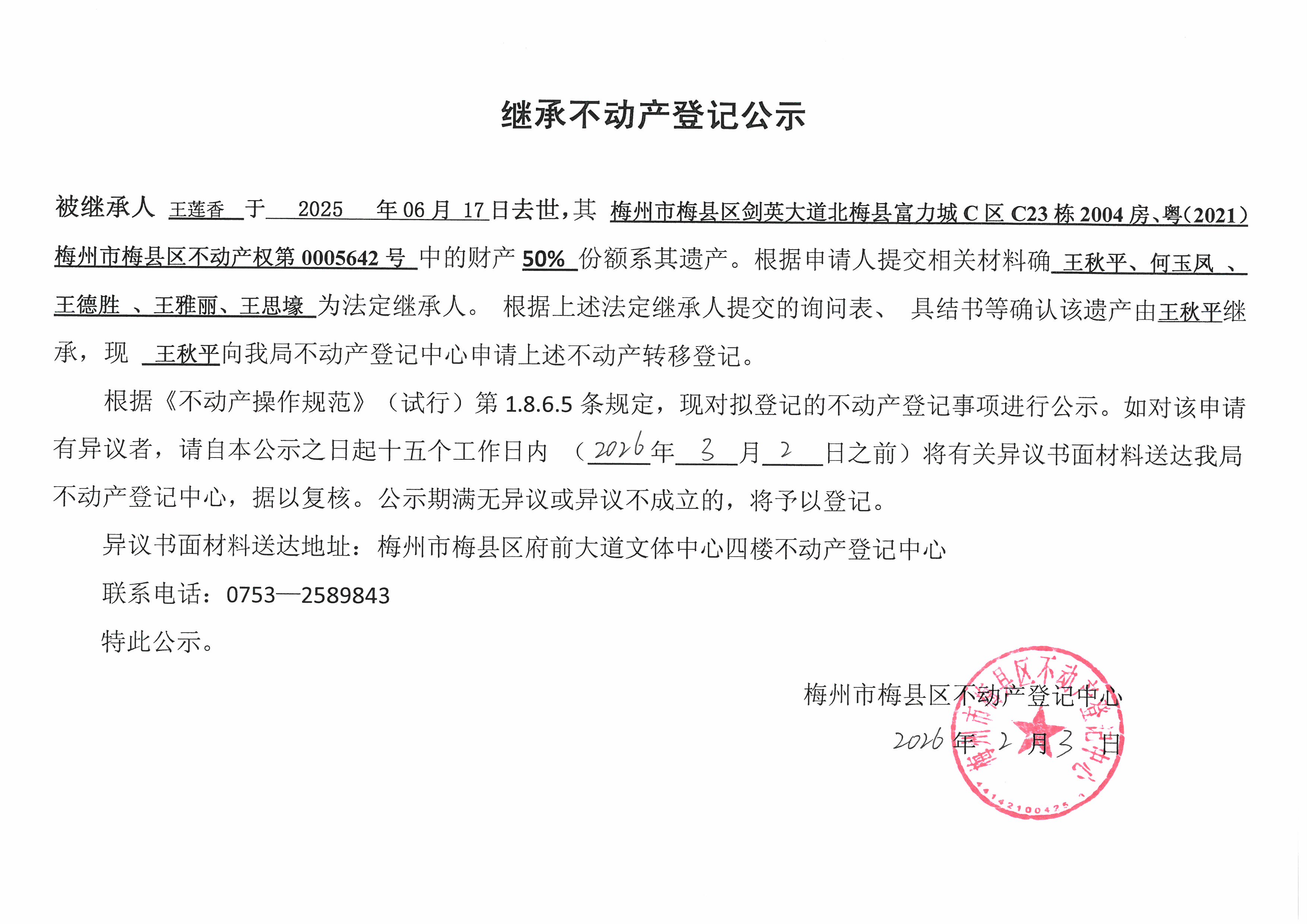 被繼承人王蓮香于2025年06月17日去世,其梅州市梅縣區劍英大道北梅縣富力城C區C23棟2004房、粵(2021)梅州市梅縣區不動產權第0005642號中的財產50%份額系其遺產。根據申請人提交相關材料確認王秋平、何玉鳳、王德勝、王雅麗、王思壕為法定繼承人。根據上述法定繼承人提交的詢問表、具結書等確認該遺產由王秋平繼承,現王秋平向我局不動產登記中心申請上述不動產轉移登記。