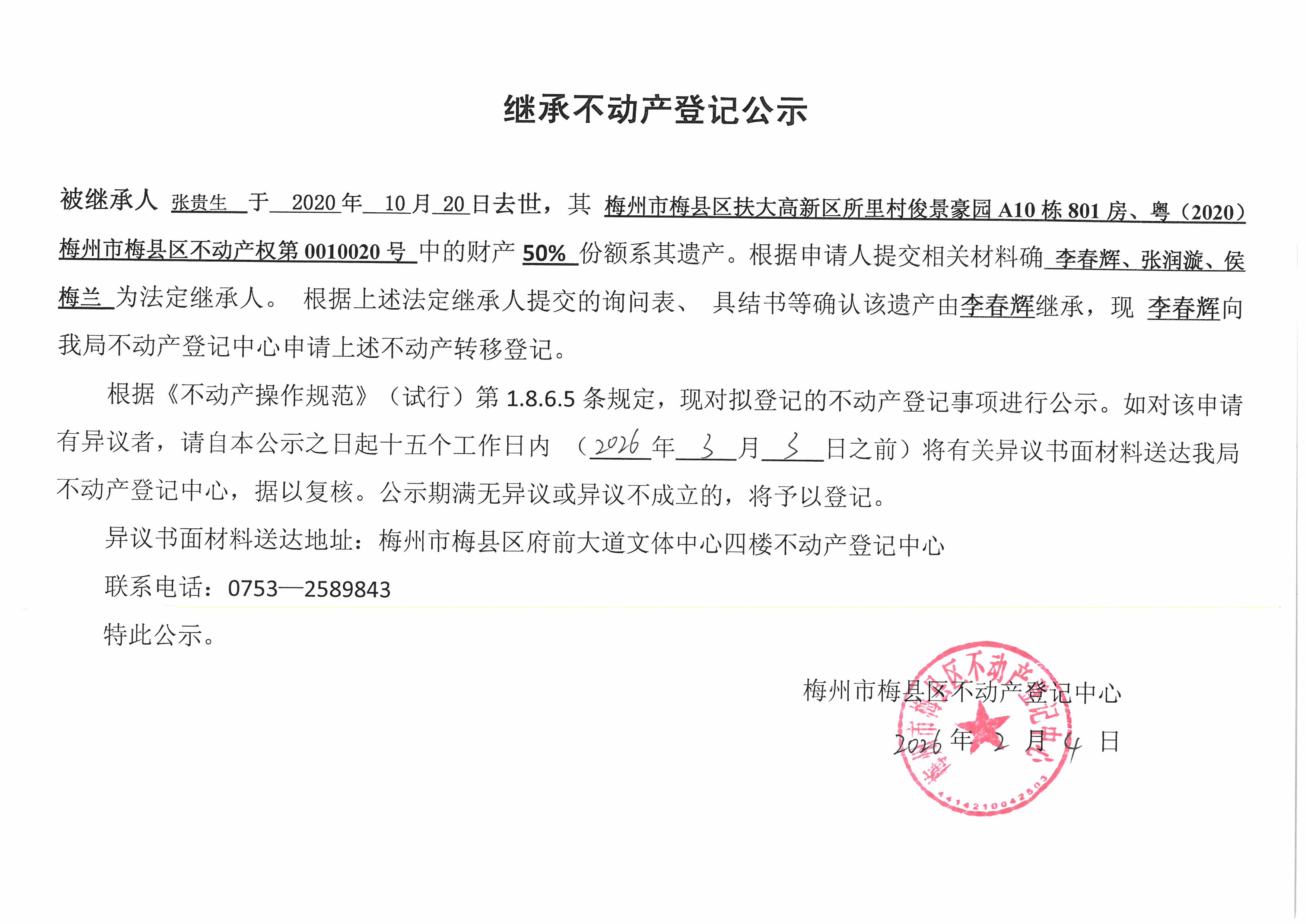 被繼承人張貴生于2020年10月20日去世,其梅州市梅縣區(qū)大高新區(qū)所里村俊景豪園A10棟801房、粵(2020)梅州市梅縣區(qū)不動(dòng)產(chǎn)權(quán)第0010020號(hào)中的財(cái)產(chǎn)50%份額系其遺產(chǎn)。根據(jù)申請(qǐng)人提交相關(guān)材料確認(rèn)李春輝、張潤(rùn)漩、侯梅蘭為法定繼承人。根據(jù)上述法定繼承人提交的詢問表、具結(jié)書等確認(rèn)該遺產(chǎn)由李春輝繼承,現(xiàn)李春輝向我局不動(dòng)產(chǎn)登記中心申請(qǐng)上述不動(dòng)產(chǎn)轉(zhuǎn)移登記。