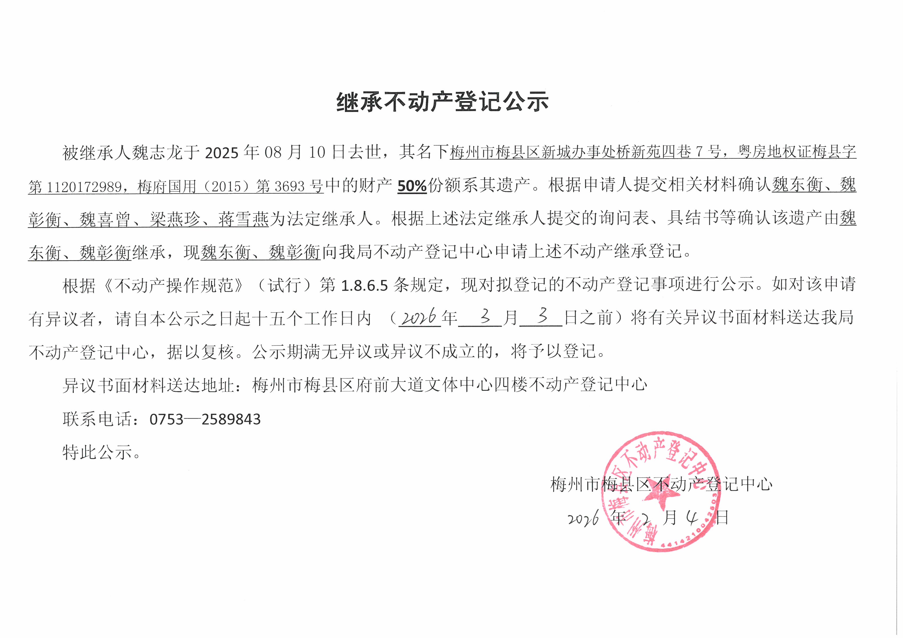 被繼承人魏志龍于2025年08月10日去世,其名下梅州市梅縣區新城辦事處橋新苑四巷7號,粵房地權證梅縣字第1120172989,梅府國用(2015)第3693號中的財產50%份額系其遺產。根據中請人提交相關材料確認魏東衡、魏彰衡、魏喜曾、梁燕珍、蔣雪燕為法定繼承人。根據上述法定繼承人提交的詢問表、具結書等確認該遺產由魏東衡、魏彰衡繼承,現魏東衡、魏彰衡向我局不動產登記中心申請上述不動產繼承登記。