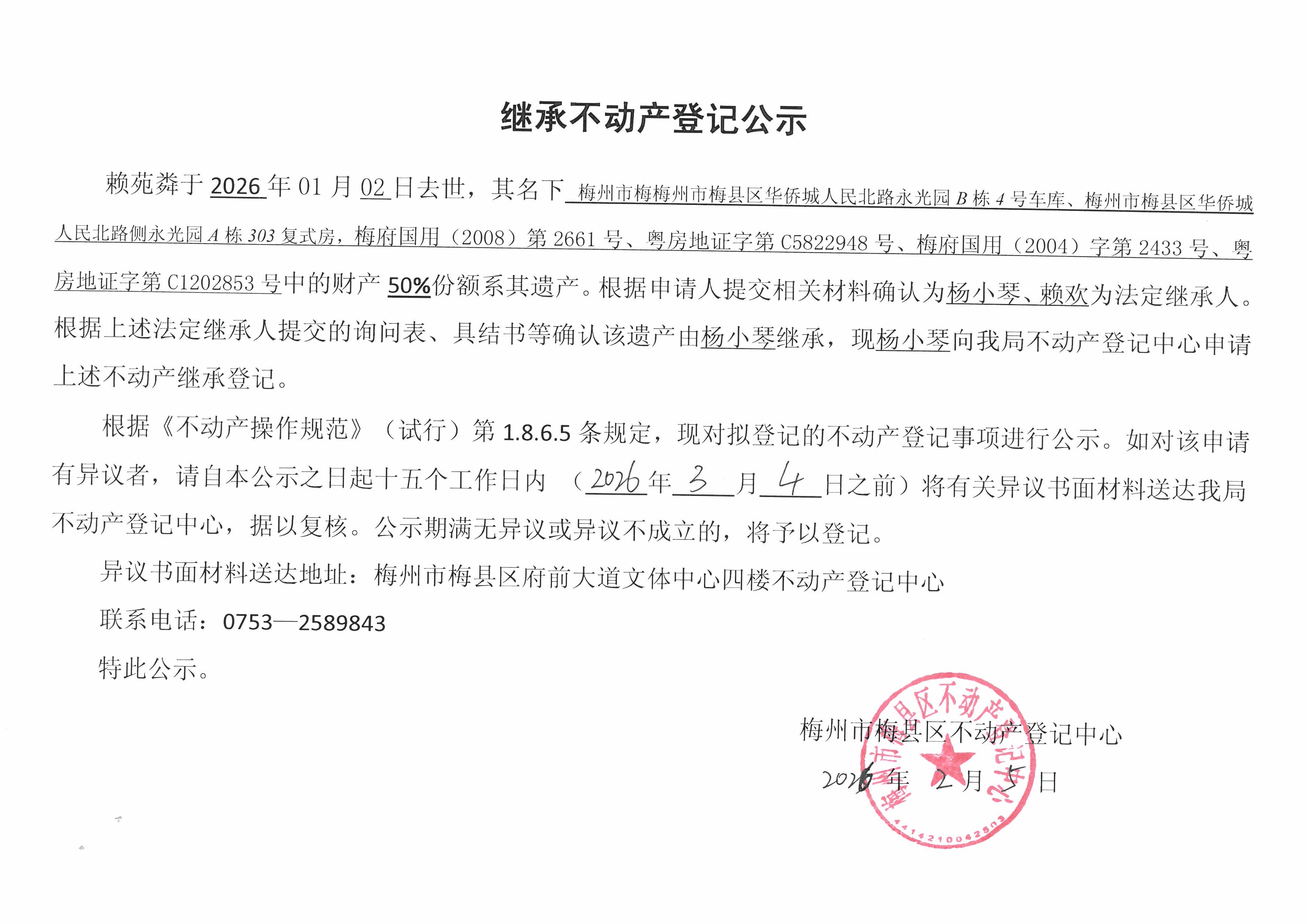 賴苑粦于2026年01月02日去世,其名下梅州市梅縣區(qū)華僑城人民北路永光園B棟4號車庫、梅州市梅縣區(qū)華僑城人民北路側(cè)永光園A棟303復(fù)式房,梅府國用(2008)第2661號、粵房地證字第C5822948號、梅府國用(2004)字第2433號、房地證字第C1202853號中的財(cái)產(chǎn)50%份額系其遺產(chǎn)。根據(jù)申請人提交相關(guān)材料確認(rèn)為楊小琴、賴歡為法定繼承人。根據(jù)上述法定繼承人提交的詢問表、具結(jié)書等確認(rèn)該遺產(chǎn)由楊小琴繼承,現(xiàn)楊小琴向我局不動產(chǎn)登記中心申請上述不動產(chǎn)繼承登記。