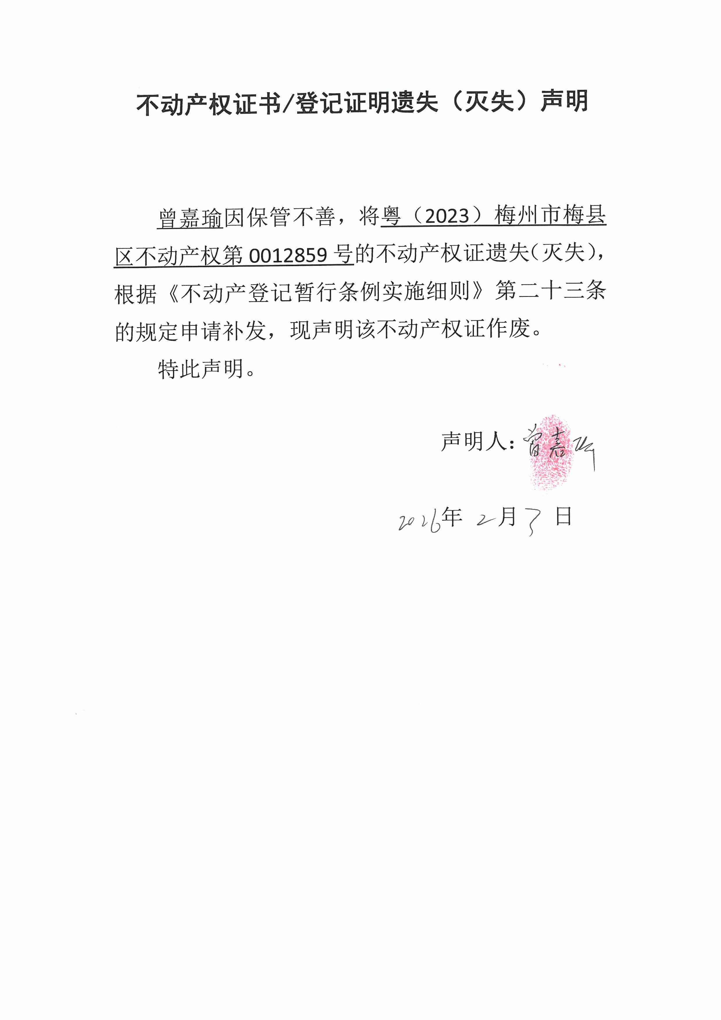 曾嘉瑜因保管不善,將粵(2023)梅州市梅縣區(qū)不動(dòng)產(chǎn)權(quán)第0012859號(hào)的不動(dòng)產(chǎn)權(quán)證遺失(滅失),根據(jù)《不動(dòng)產(chǎn)登記暫行條例實(shí)施細(xì)則》第二十三條的規(guī)定申請(qǐng)補(bǔ)發(fā),現(xiàn)聲明該不動(dòng)產(chǎn)權(quán)證作廢。