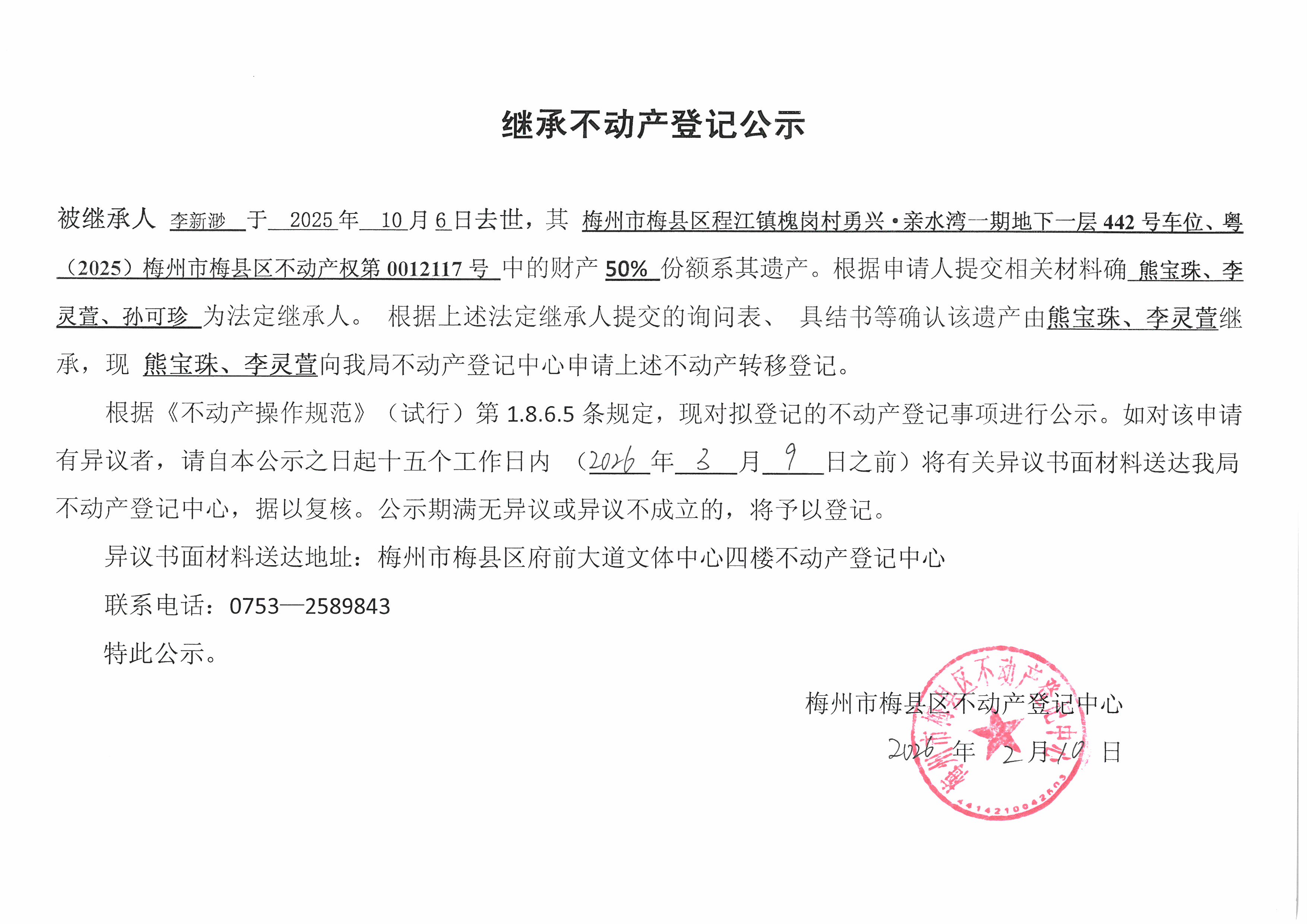 被繼承人李新渺于2025年10月6日去世,其梅州市梅縣區(qū)程江鎮(zhèn)槐崗村勇興·親水灣一期地下一層442號車位、粵(2025)梅州市梅縣區(qū)不動產(chǎn)權(quán)第0012117號中的財(cái)產(chǎn)50%份額系其遺產(chǎn)。根據(jù)申請人提交相關(guān)材料確認(rèn)熊寶珠、李靈萱、孫可珍為法定繼承人。根據(jù)上述法定繼承人提交的詢問表、具結(jié)書等確認(rèn)該遺產(chǎn)由熊寶珠、李靈萱繼承,現(xiàn)熊寶珠、李靈萱向我局不動產(chǎn)登記中心申請上述不動產(chǎn)轉(zhuǎn)移登記。