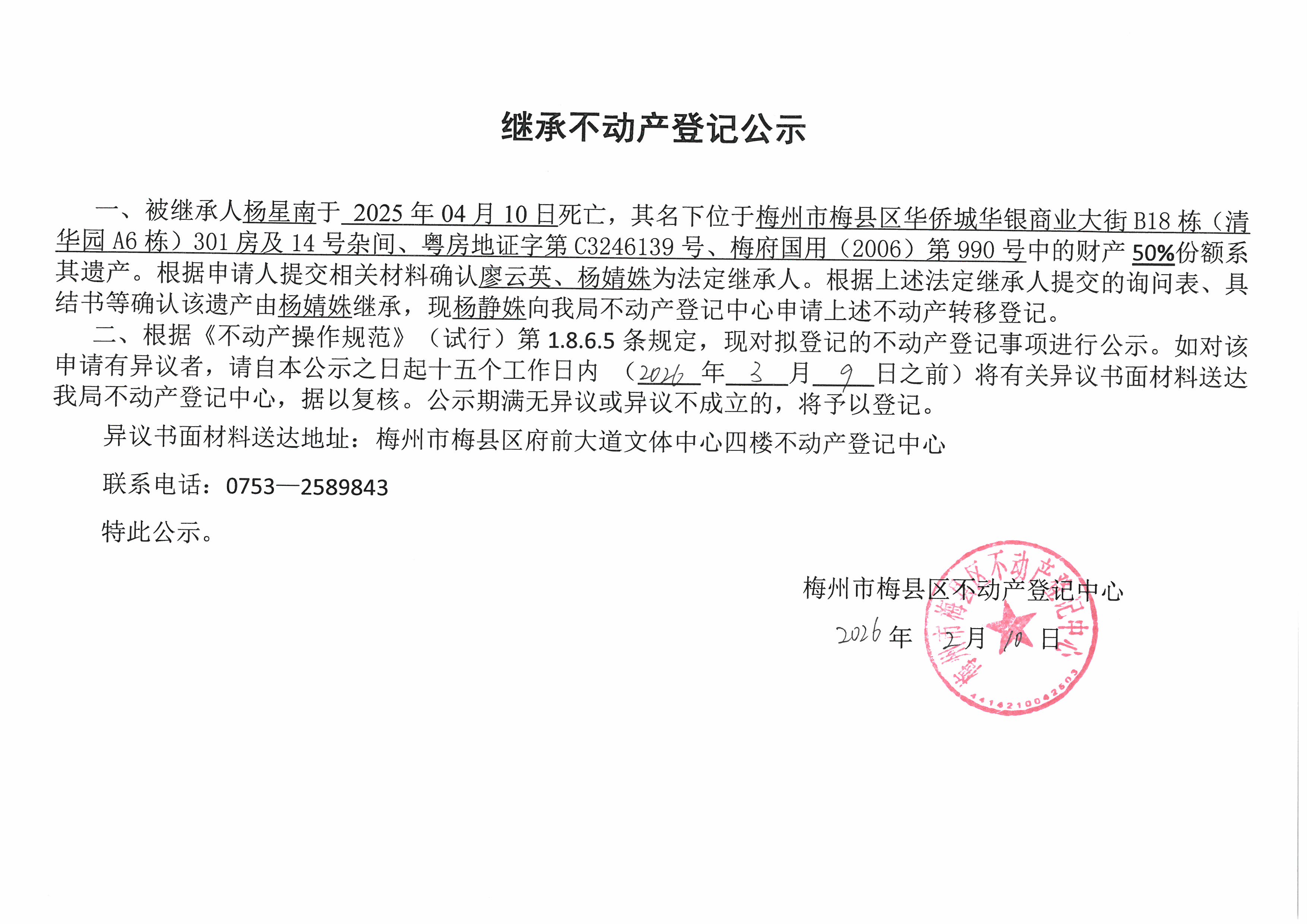 被繼承人楊星南于2025年04月10日死亡,其名下位于梅州市梅縣區華僑城華銀商業大街B18棟(清華園A6棟)301房及14號雜間、粵房地證字第C3246139號、梅府國用(2006)第990號中的財產50%份額系其遺產。根據申請人提交相關材料確認廖云英、楊婧姝為法定繼承人。根據上述法定繼承人提交的詢問表、具結書等確認該遺產由楊婧姝繼承,現楊婧姝向我局不動產登記中心申請上述不動產轉移登記。