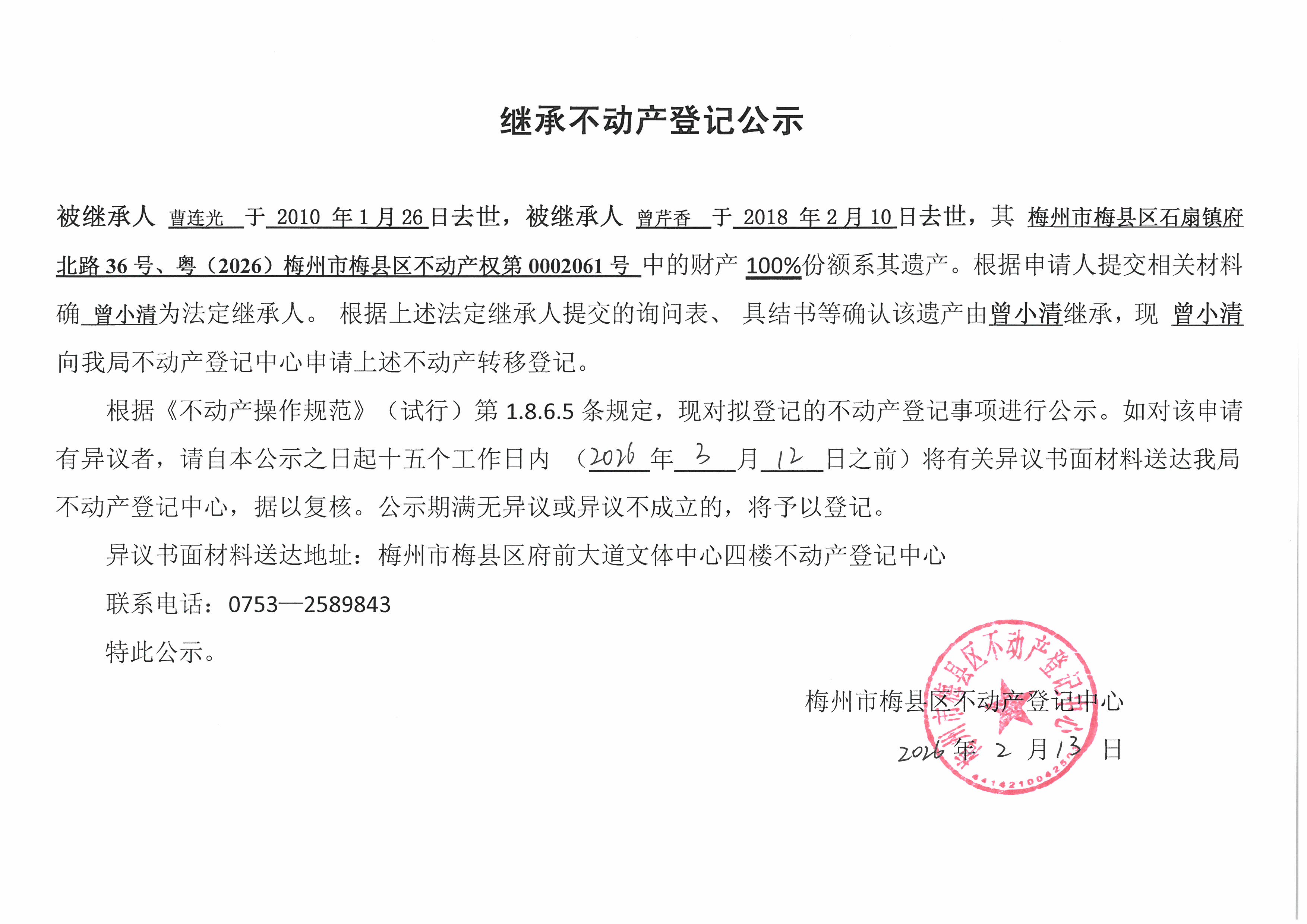 被繼承人曹連光于2010年1月26日去世,被繼承人曾芹香于2018年2月10日去世,其梅州市梅縣區(qū)石鎮(zhèn)府北路36號、粵(2026)梅州市梅縣區(qū)不動產(chǎn)權(quán)第0002061號中的財產(chǎn)100%份額系其遺產(chǎn)。根據(jù)申請人提交相關(guān)材料確認(rèn)曾小清為法定繼承人。根據(jù)上述法定繼承人提交的詢問表、具結(jié)書等確認(rèn)該遺產(chǎn)由曾小清繼承,現(xiàn)曾小清向我局不動產(chǎn)登記中心申請上述不動產(chǎn)轉(zhuǎn)移登記。
