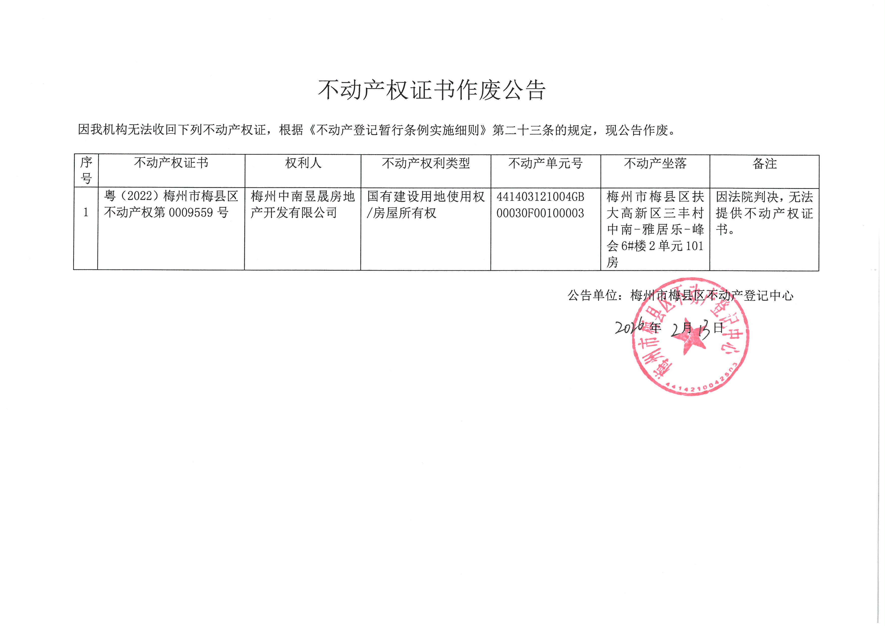 不動產登記中心登記公告(作廢公告-梅州中南昱晟房地產開發有限公司-粵(2022)梅州市梅縣區不動產權第0009559號)
