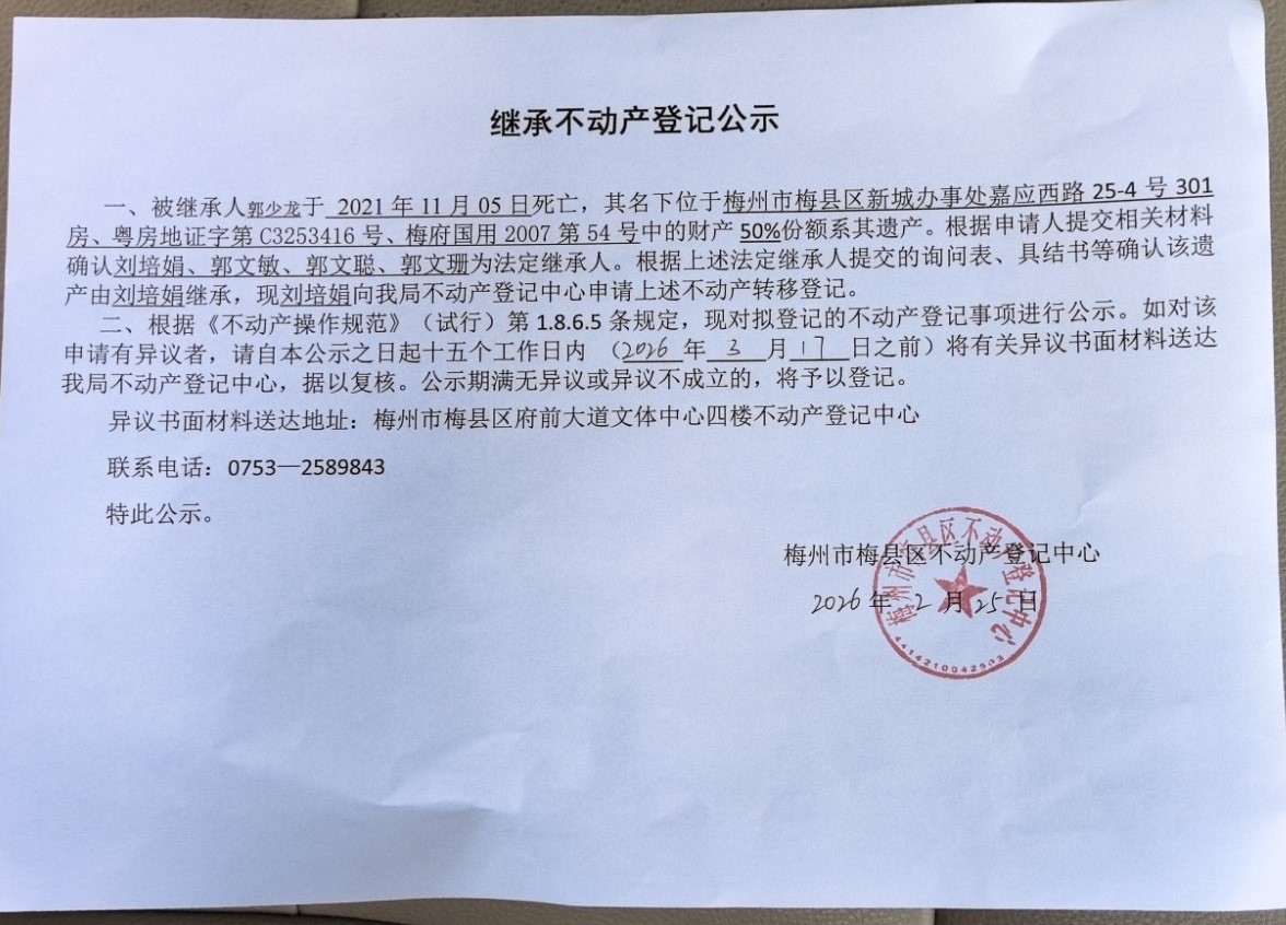 被繼承人郭少龍于2021年11月05日死亡,其名下位于梅州市梅縣區新城辦事處嘉應西路25-4號301房、粵房地證字第C3253416號、梅府國用2007第54號中的財產50%份額系其遺產。根據申請人提交相關材料確認劉培娟、郭文敏、郭文聰、郭文珊為法定繼承人。根據上述法定繼承人提交的詢問表、具結書等確認該遺產由劉培娟繼承,現劉培娟向我局不動產登記中心申請上述不動產轉移登記。