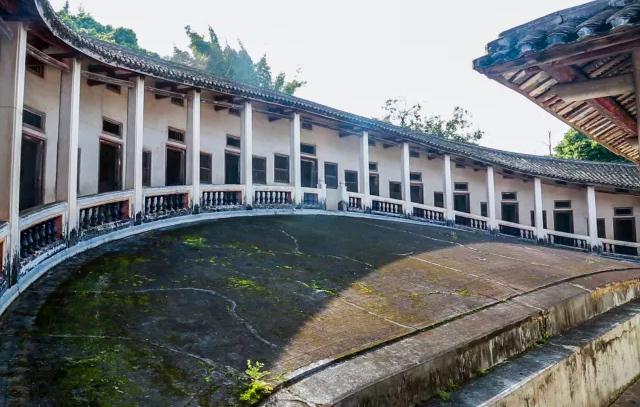 東華廬依山而建,前低后高,堂屋背后半圓形圍龍檐廊采用立柱加圍欄,線條圓潤舒暢,氣勢如虹。