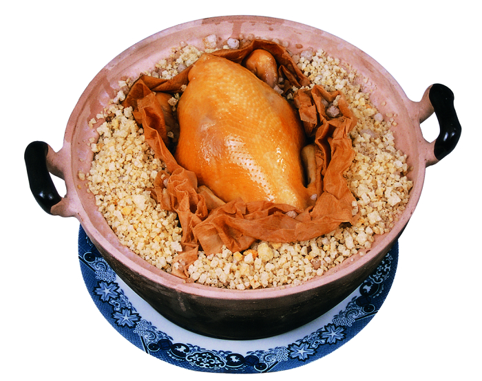 原料:重1500克左右的肥嫩項雞1只(毛黃、嘴黃、腳黃、下過蛋的母雞稱項雞)、姜片、蔥條各10克、香菜25克、粗鹽2500克、精鹽13 克、味精7克、八角末、沙姜末各2.5克、芝麻油1克、熟豬油120克、花生油15克沙紙2張。