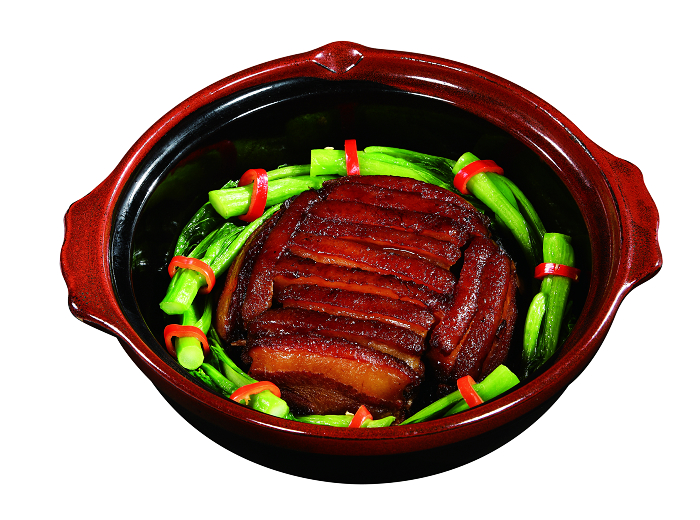 ③將梅菜心洗凈,切成長3厘米、寬1厘米的片,用白糖、淺色醬油拌勻,放在肉上,再蒸5分鐘取出,濾出原汁,然后將肉復扣在深碟中,將原汁燒滾,加生粉水勾稀芡淋入深碟中即可。