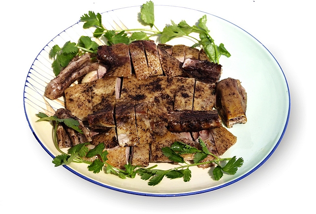 選光鴨一只洗凈,將鹽、生抽、五香粉、姜片、蔥條、米酒、白糖、味精、麻油分別涂在鴨腔內外,放入冷藏腌制12個小時以上,取出吊干,整只放入蒸籠蒸至剛熟取出,風干,食用時斬件上盤。