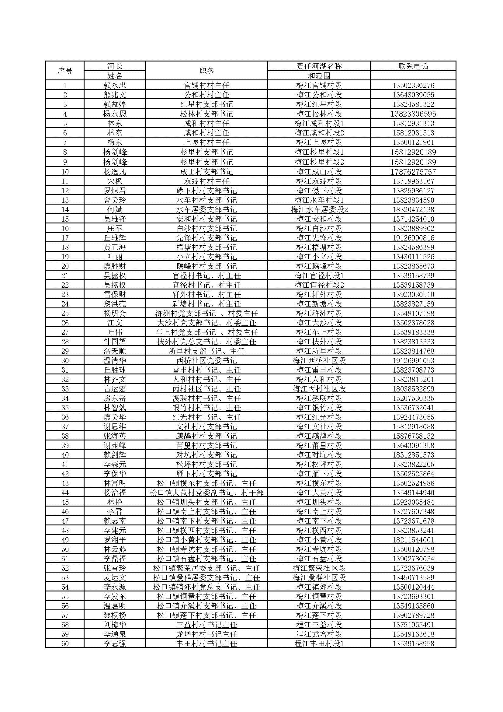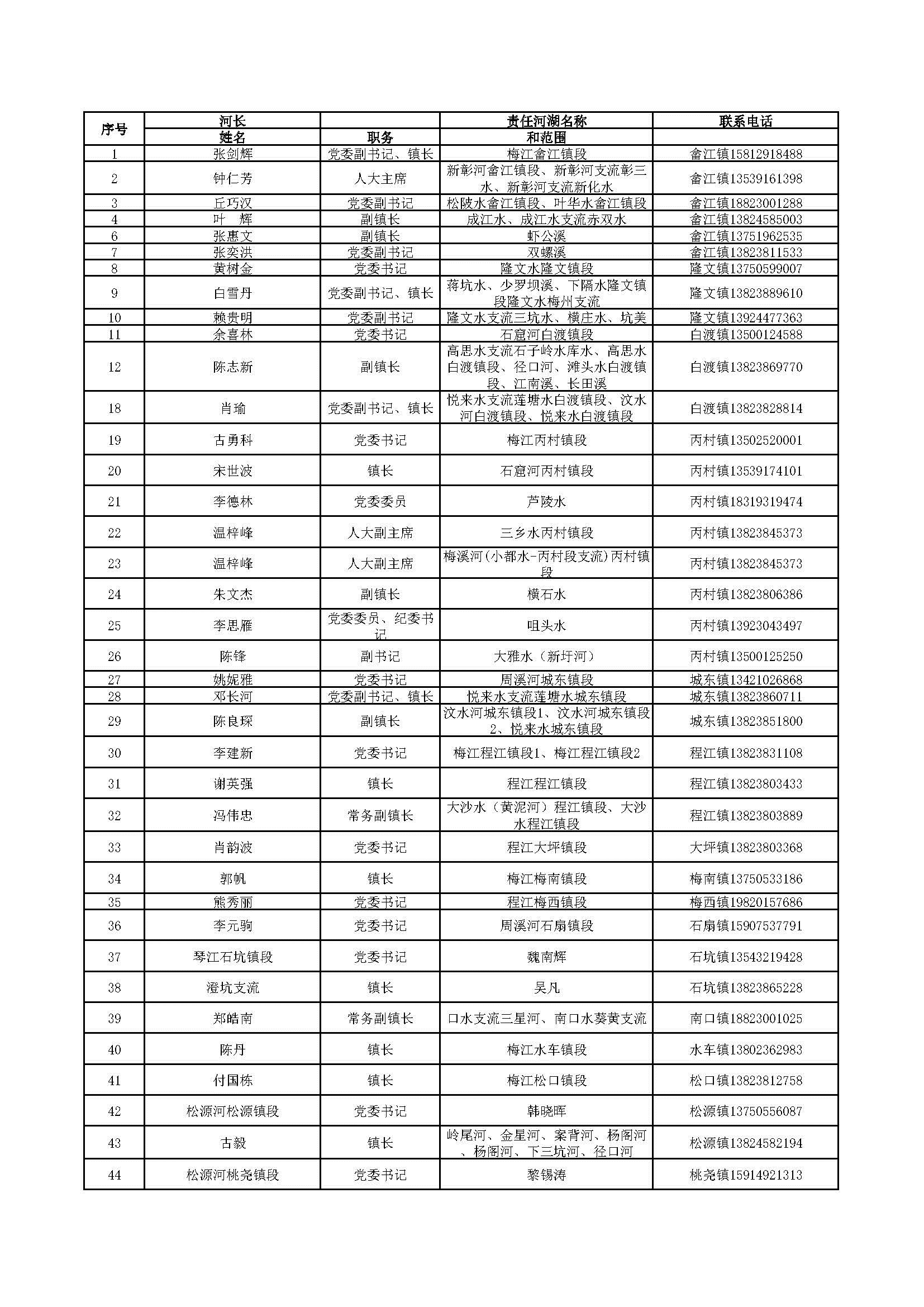 為深入貫徹落實(shí)黨中央、國(guó)務(wù)院、省、市關(guān)于全面推行河湖長(zhǎng)制的決策部署,加強(qiáng)我區(qū)河湖長(zhǎng)制工作的組織領(lǐng)導(dǎo),自覺(jué)接受社會(huì)監(jiān)督,現(xiàn)將梅縣區(qū)三級(jí)河長(zhǎng)名單向社會(huì)公告。