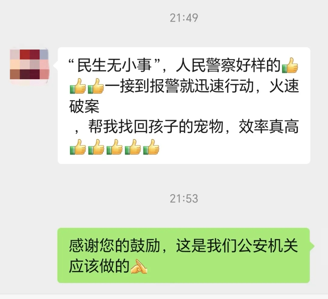 寵物鴨的失而復(fù)得,讓宋女士及其女兒倍感欣喜。宋女士特意在微信朋友圈發(fā)文,對(duì)公安機(jī)關(guān)快速破案、一心為民的工作作風(fēng)表示衷心感謝,并向辦案民警發(fā)送了一段感謝話語。這份來自群眾的肯定,是對(duì)公安工作最大的鼓勵(lì)和支持。