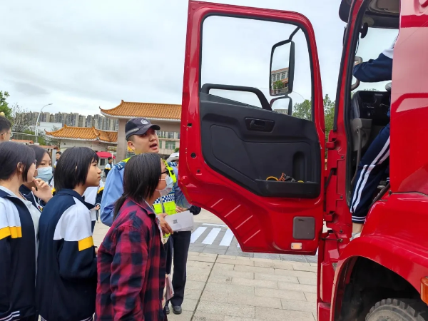 此次活動摒棄了傳統的課堂講授模式,創新性地采用了戶外模擬情景體驗的方式。在現場,民警們精心設置了模擬大貨車駕駛位及周邊盲區范圍。學生們在民警的引導下,輪流坐上駕駛室,親身體驗司機的視角。當他們從高高的駕駛艙望出去,才真切地認識到,車輛前方、側方及后方存在著大片“看不見”的危險區域,這就是致命的大貨車視覺盲區。