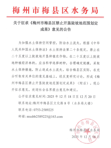 關于征求《梅州市梅縣區禁止開墾陡坡地范圍劃定成果》意見的公告