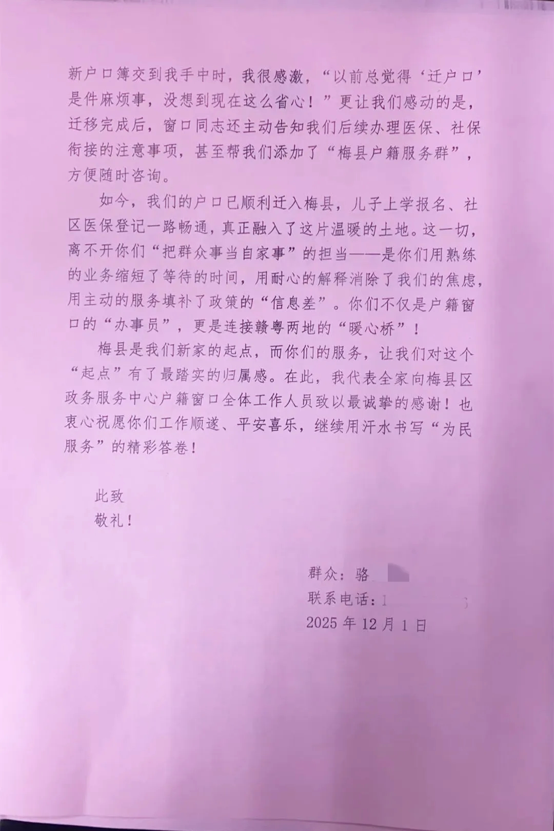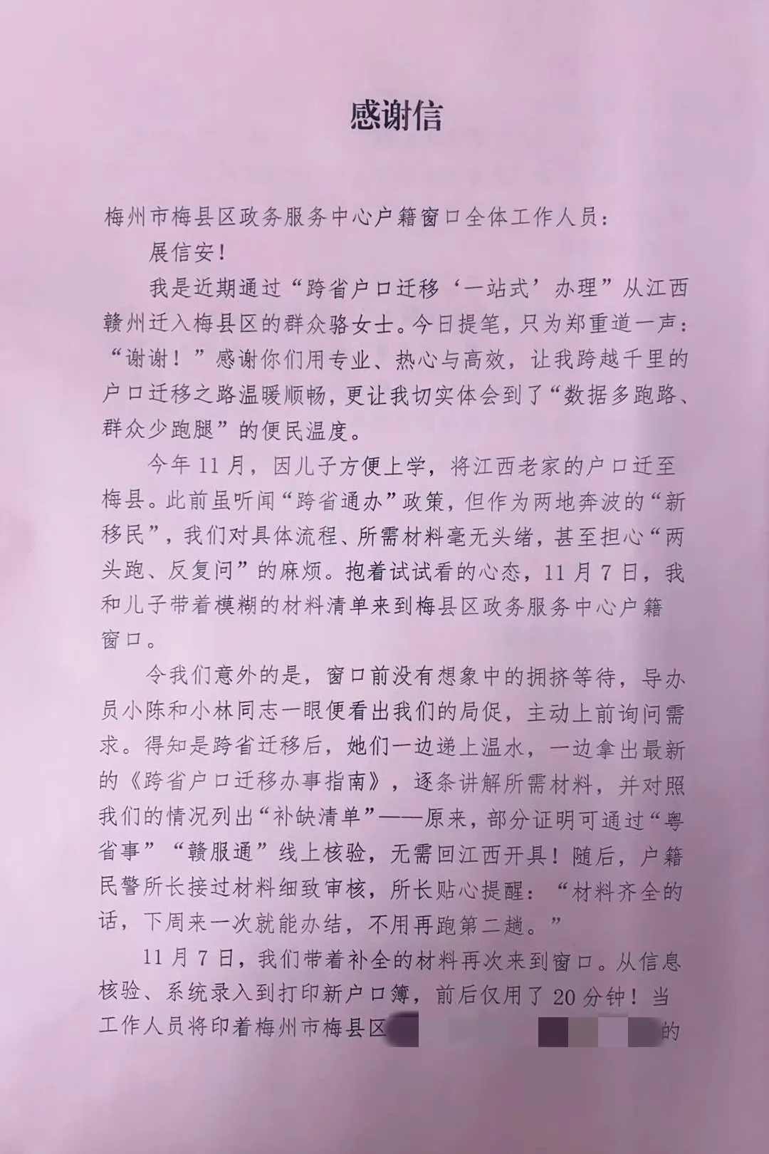 駱女士在信中寫道,工作人員“用熟練的業(yè)務(wù)縮短等待,用耐心的解釋消除焦慮”,稱贊他們是連接贛粵的“暖心橋”。下一步,梅縣區(qū)政務(wù)服務(wù)中心戶政窗口將繼續(xù)堅持以人民為中心的發(fā)展思想,不斷優(yōu)化辦事流程,創(chuàng)新服務(wù)方式,深化“跨省通辦”服務(wù),讓數(shù)據(jù)多跑路、群眾少跑腿,持續(xù)提升政務(wù)服務(wù)溫度和效率。