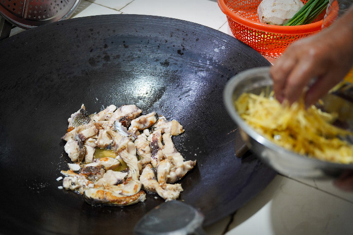 魚燜飯中的魚,便是整道菜肴的靈魂所在??图胰送ǔ_x用野生草魚作為主料,因為這種魚肉質細嫩,味道鮮美,且富含優質蛋白質和不飽和脂肪酸。為了保證魚的新鮮度,阿叔提前在院子的魚塘打撈好魚,確保魚在捕撈后能夠迅速被用于烹飪,其中的魚血是魚燜飯中不可或缺的原料之一。