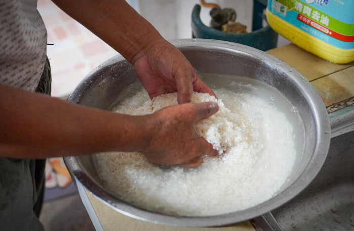 客家魚燜飯的制作,始于對食材的極致追求。掌勺的阿叔向實踐團介紹了魚燜飯的選材,作為燜飯的基礎,米的選擇至關重要。他們堅持使用當季新收的優質稻米,這些稻米顆粒飽滿,色澤晶瑩,富含多種營養成分。