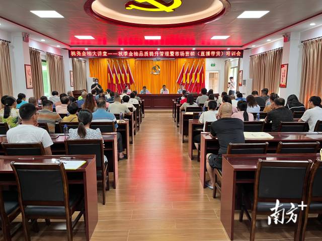 眼下正值蜜柚(早熟柚)成熟下樹關鍵期,為提升柚果品質(zhì)、拓寬銷售渠道,助力金柚產(chǎn)業(yè)高質(zhì)量發(fā)展,8月21日,梅縣區(qū)桃堯鎮(zhèn)舉辦桃堯金柚大講堂——秋季金柚品質(zhì)提升管理暨市場營銷(直播帶貨)培訓會。本土柚果經(jīng)營主體、種植大戶等50人參會,為即將到來的金柚采收季做好充分準備。