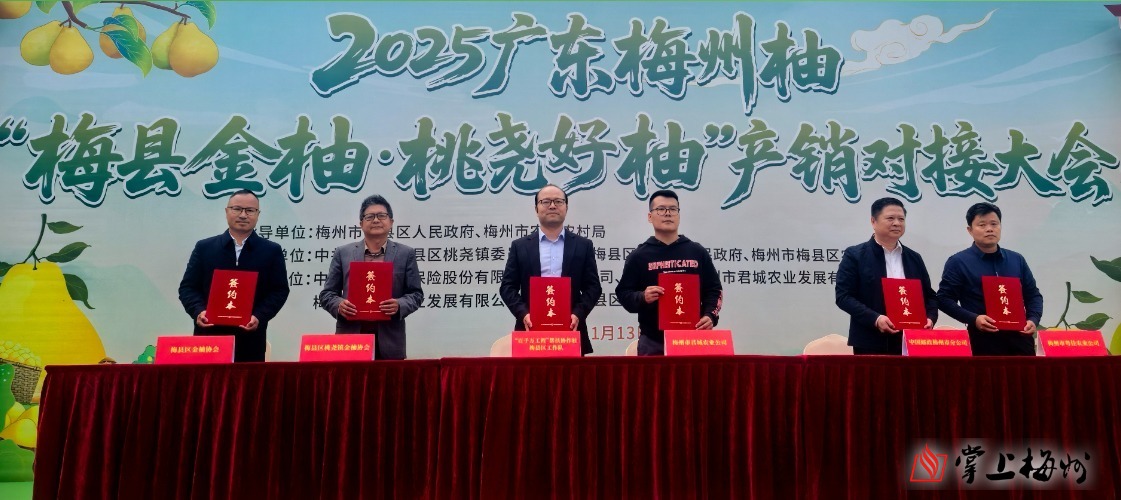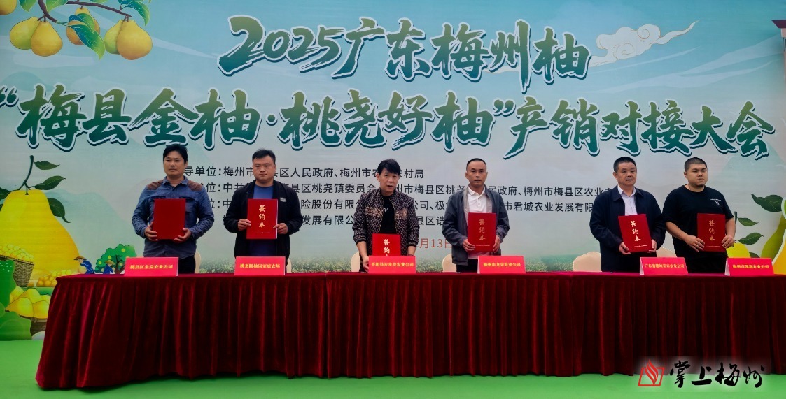 活動現場,通報了2025年“梅縣金柚·桃堯好柚”產量、品質和營銷情況,并進行銷售推介;舉行了銷售簽約儀式和戰略合作簽約儀式,6家“桃堯好柚”種植經營戶與6家采購商進行銷售簽約推動桃堯金柚產銷對接,極兔速遞、中國人民財產保險公司梅縣支公司與梅縣區桃堯鎮金柚協會簽訂物流保障、保險護航金柚產業發展戰略合作框架協議。