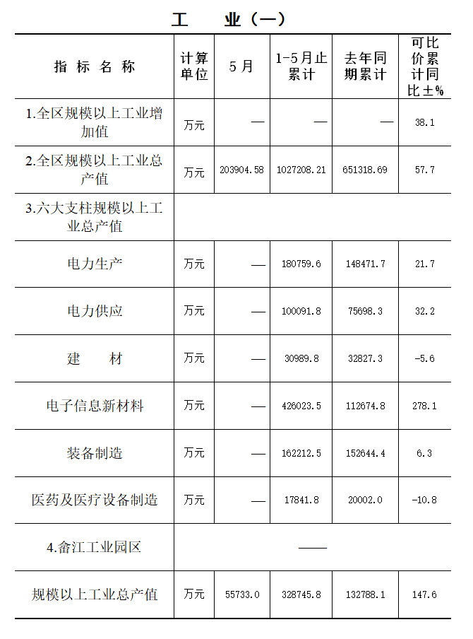 1-5月,全區(qū)規(guī)模以上工業(yè)增加值同比增長(zhǎng)38.1%;實(shí)現(xiàn)工業(yè)總產(chǎn)值102.72億元,同比增長(zhǎng)57.7%