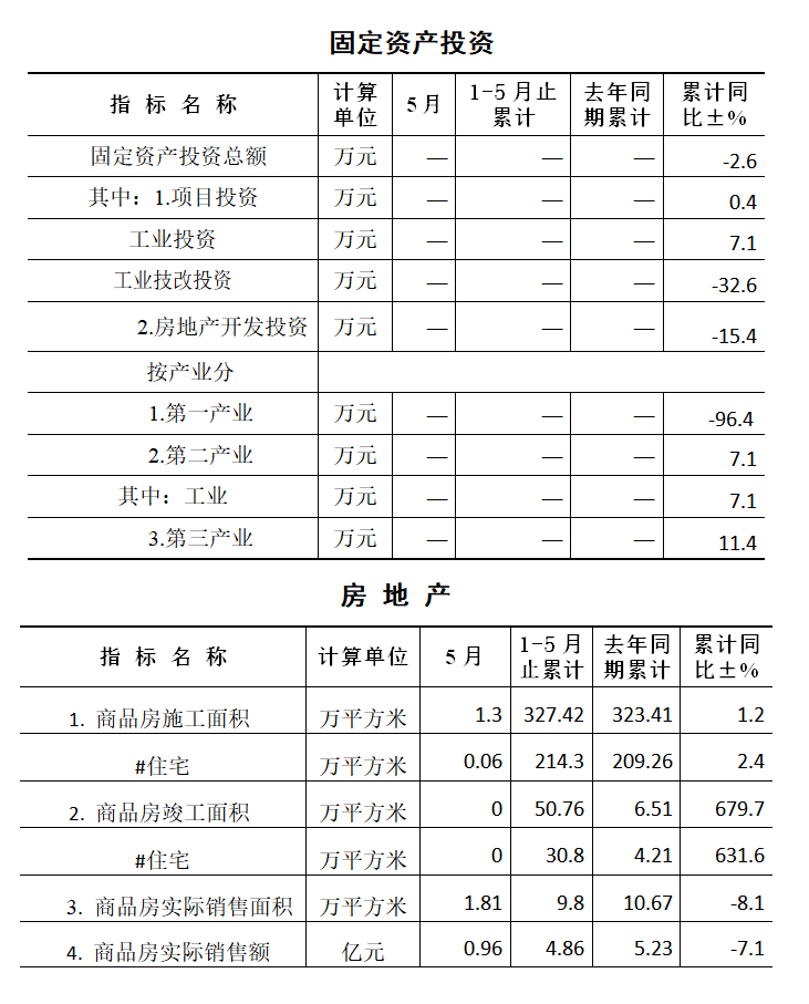 1-5月,全區(qū)固定資產(chǎn)投資同比下降2.6%。其中:項(xiàng)目投資同比增長(zhǎng)0.4%;項(xiàng)目投資中,工業(yè)投資同比增長(zhǎng)7.1%;技改投資同比下降32.6%;房地產(chǎn)投資同比下降15.4%