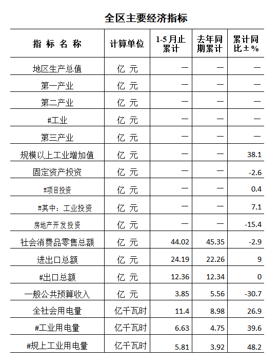 1-5月,全區(qū)公共財(cái)政一般預(yù)算收入完成3.85億元,同比下降30.7%;一般公共預(yù)算支出完成26.07億元,同比增長(zhǎng)7.5%