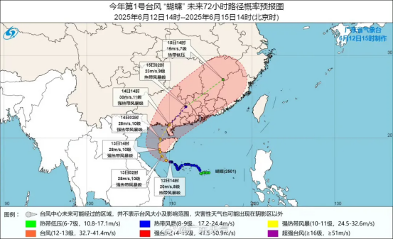 6月12日16時,今年第1號臺風(fēng)“蝴蝶”(熱帶風(fēng)暴級,9級,23米/秒)中心位于海南省三亞市南偏東方向約125公里的海面上。