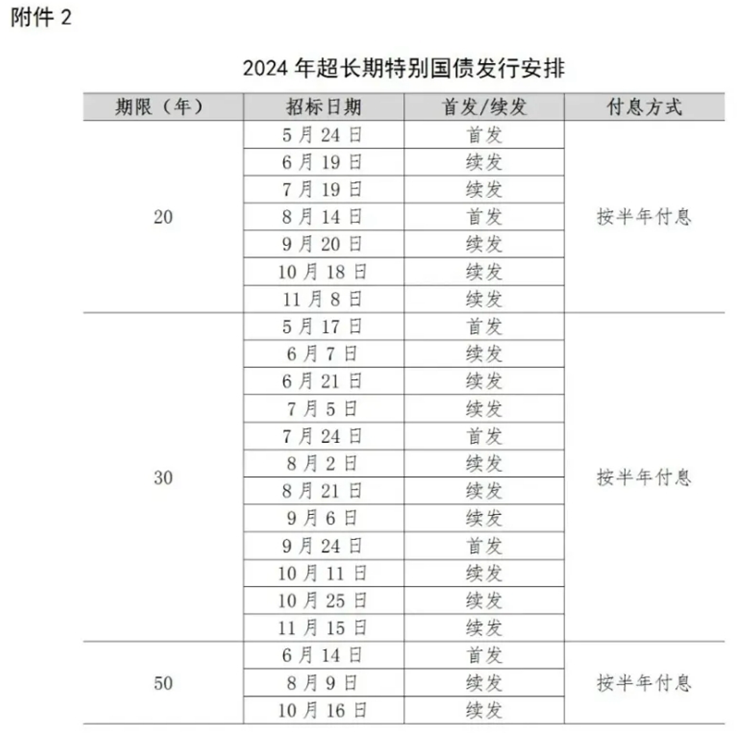 從“日程表”看,自5月中旬持續(xù)至11月中旬,20年、30年和50年超長(zhǎng)期特別國(guó)債將分別發(fā)行7期、12期、3期,首發(fā)日期分別為5月24日、5月17日、6月14日。
